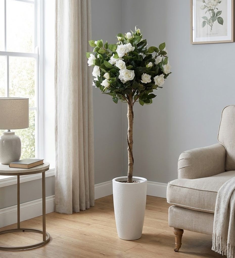 Je to ideální volba pro ty, kteří milují vzhled kvetoucích růží, ale chtějí si užívat jejich krásu bez starostí s péčí. Bílá barva působí svěže, čistě a vnáší do interiéru klid a harmonii. S výškou 120 cm se stane nepřehlédnutelnou ozdobou vašeho obývacího pokoje, ložnice nebo vstupní haly.