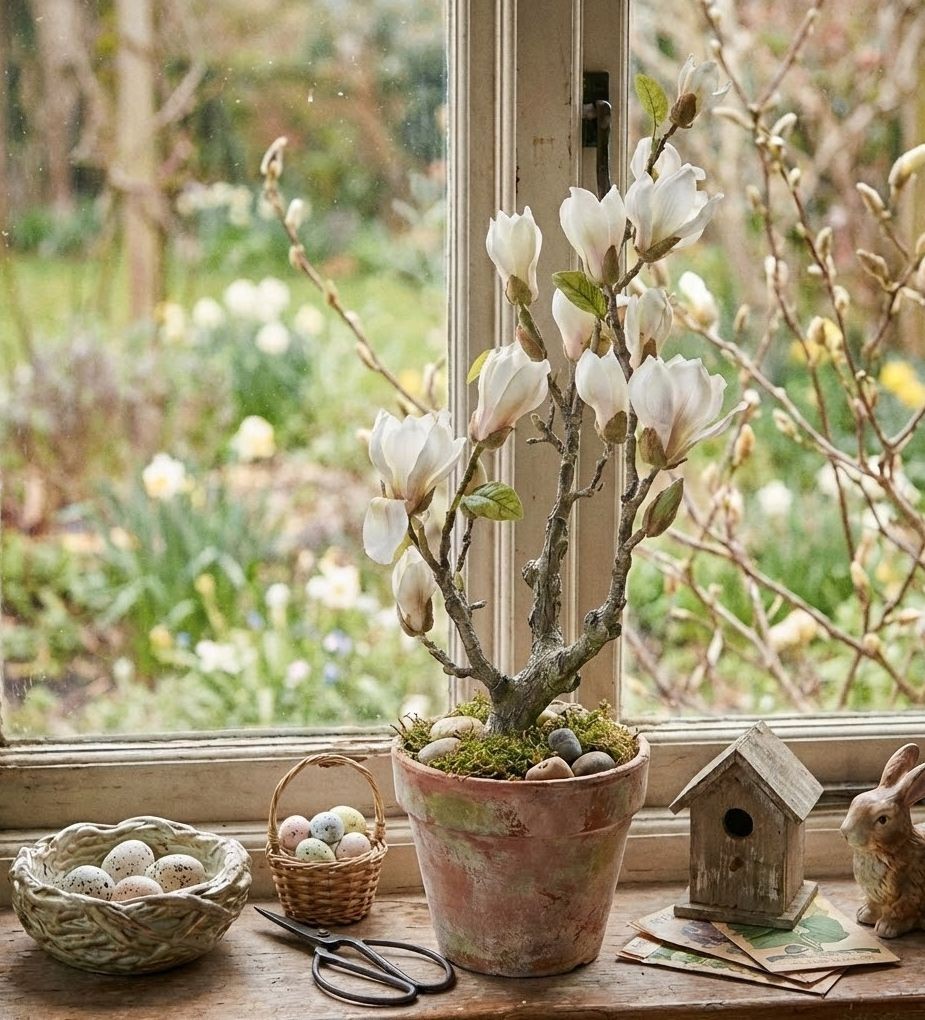 Vneste do svého interiéru svěžest a eleganci s tímto nádherným stromkem magnólie. Jemné bílé květy symbolizují čistotu a nový začátek, díky čemuž tento doplněk okamžitě prozáří i ten nejtmavší kout místnosti. Díky kompaktnější velikosti je ideální dekorací na stoly, komody nebo okenní parapety.