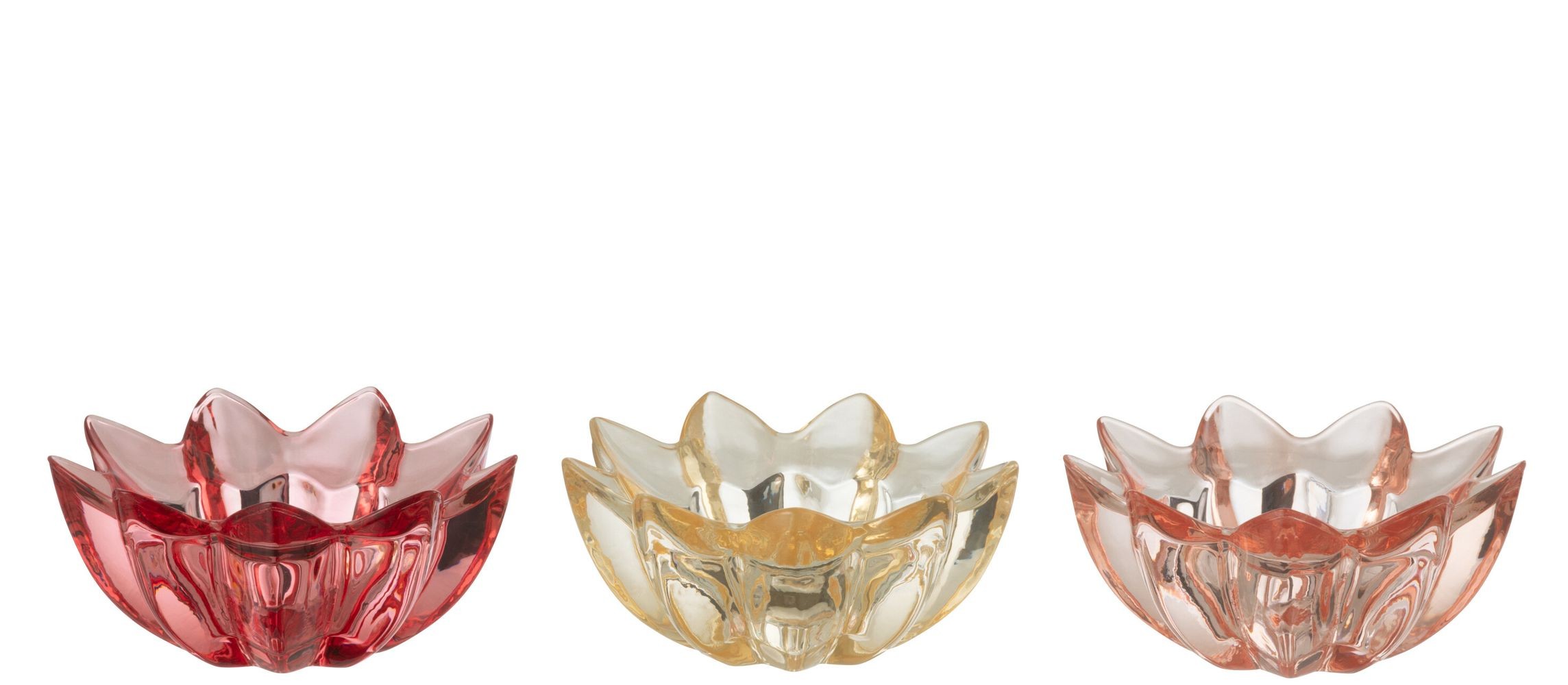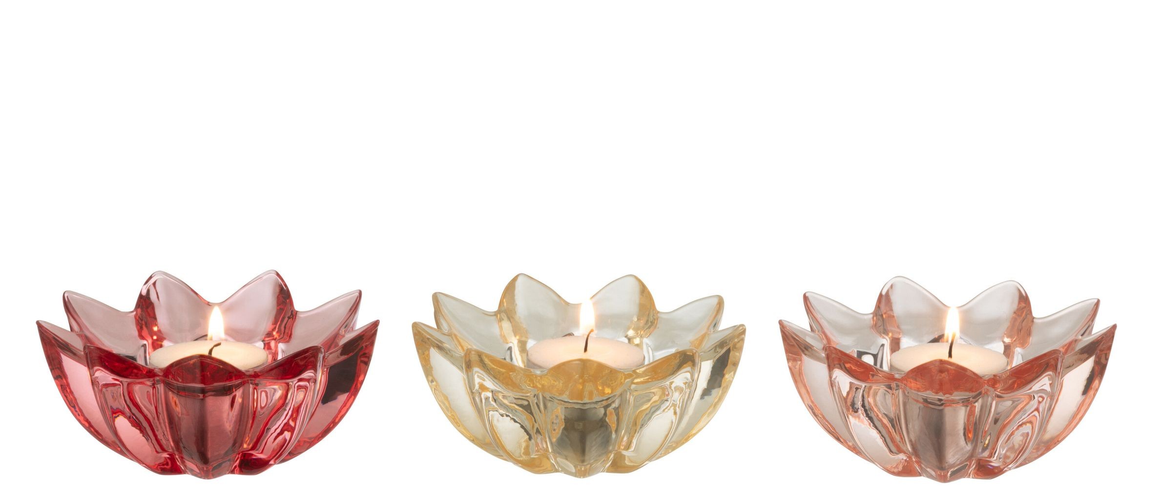 Vneste do svého domova kouzlo a romantickou atmosféru s touto sadou tří elegantních skleněných svícnů ve tvaru rozkvetlého květu.