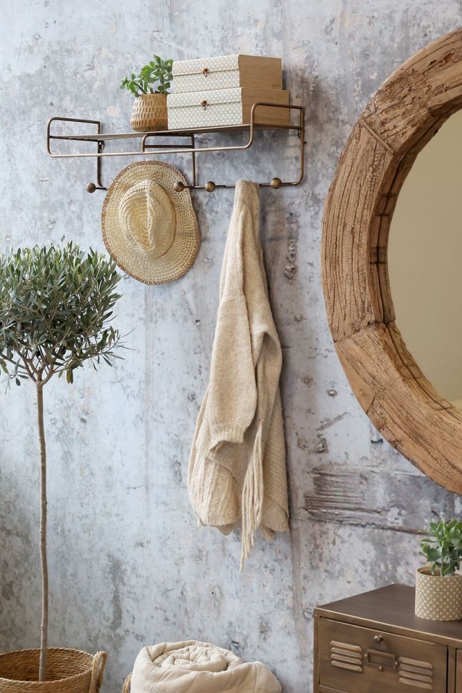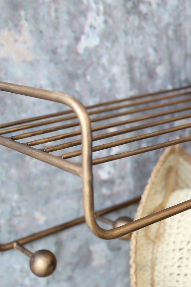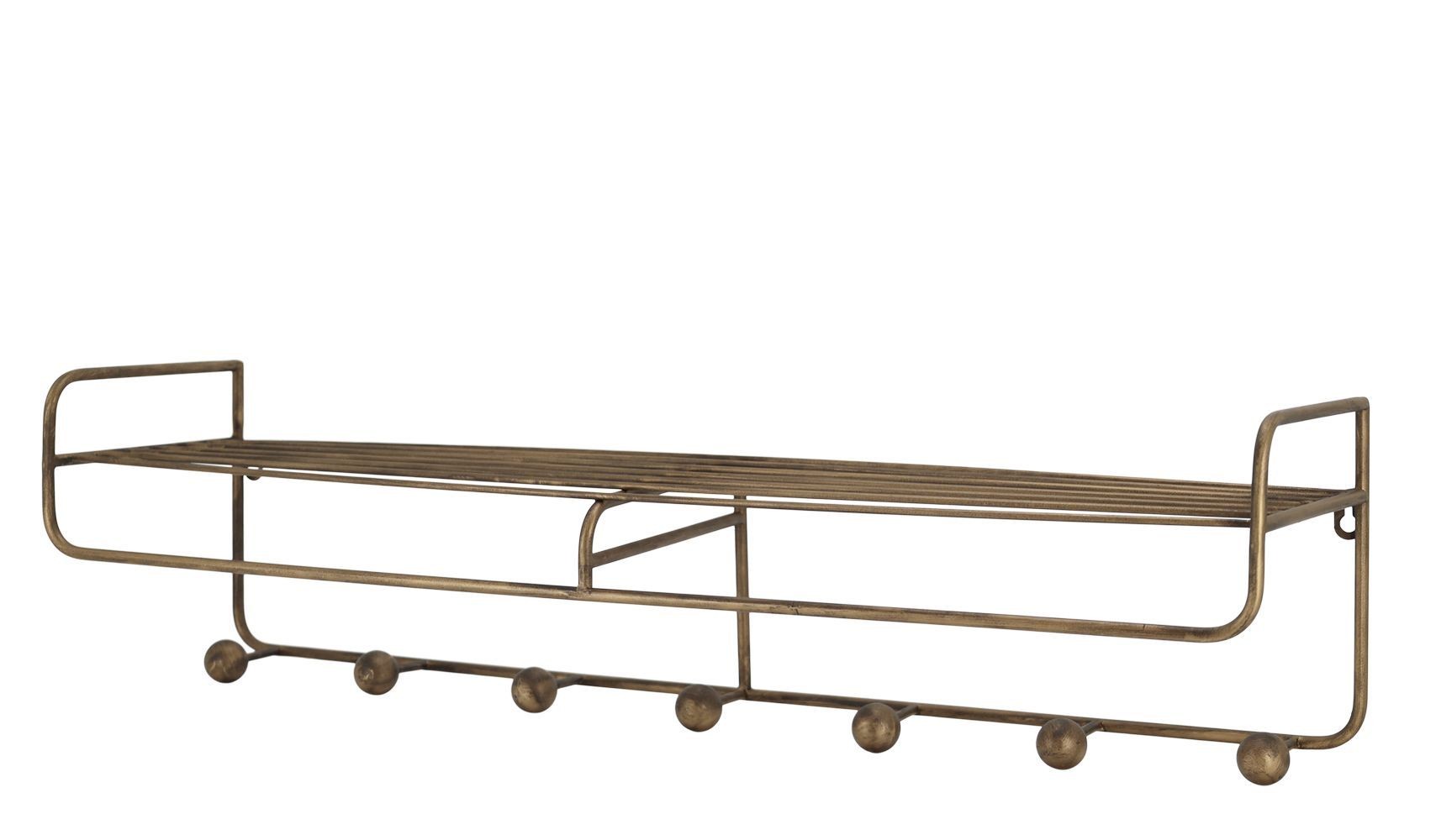 Vneste do svého domova nádech starých časů s nástěnnou policí Dianne. Tato kovová police v provedení mosazná antik v sobě spojuje industriální design s elegancí vintage stylu. Díky své šířce 80 cm a kombinaci odkládací plochy s háčky je perfektním řešením pro organizaci vaší předsíně, koupelny nebo kuchyně.