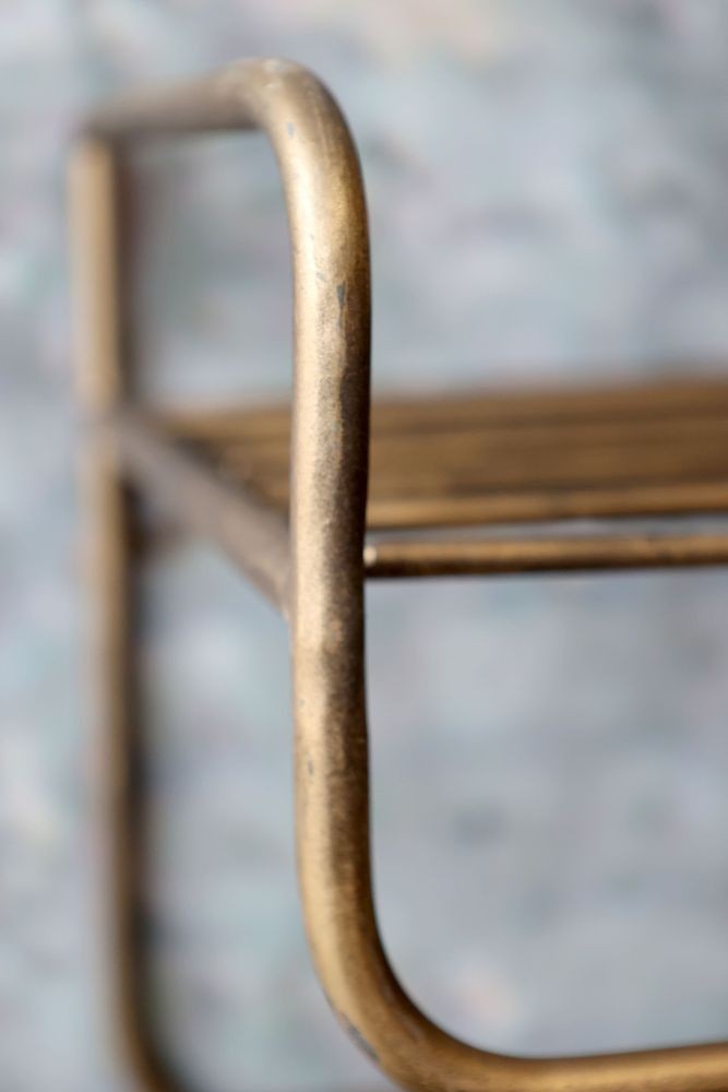 Police Dianne není jen praktickým úložným prostorem, ale i výrazným dekorativním prvkem. Je vyrobena z pevného kovu s povrchovou úpravou v tlumeném zlatavém odstínu s patinou, který působí teple a luxusně, nikoliv však křiklavě.