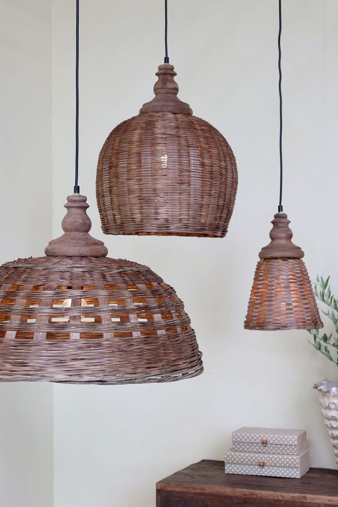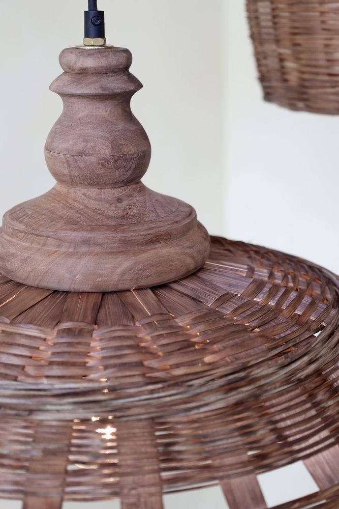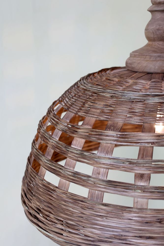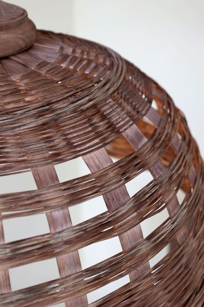 Na rozdíl od své menší varianty má toto svítidlo tvar široké kopule, díky čemuž světlo krásně rozprostře do celého prostoru. Konstrukce kombinuje horní ozdobný díl ze soustruženého dřeva, který plynule přechází do samotného stínidla z ručně vyplétaných ratanových pásků.