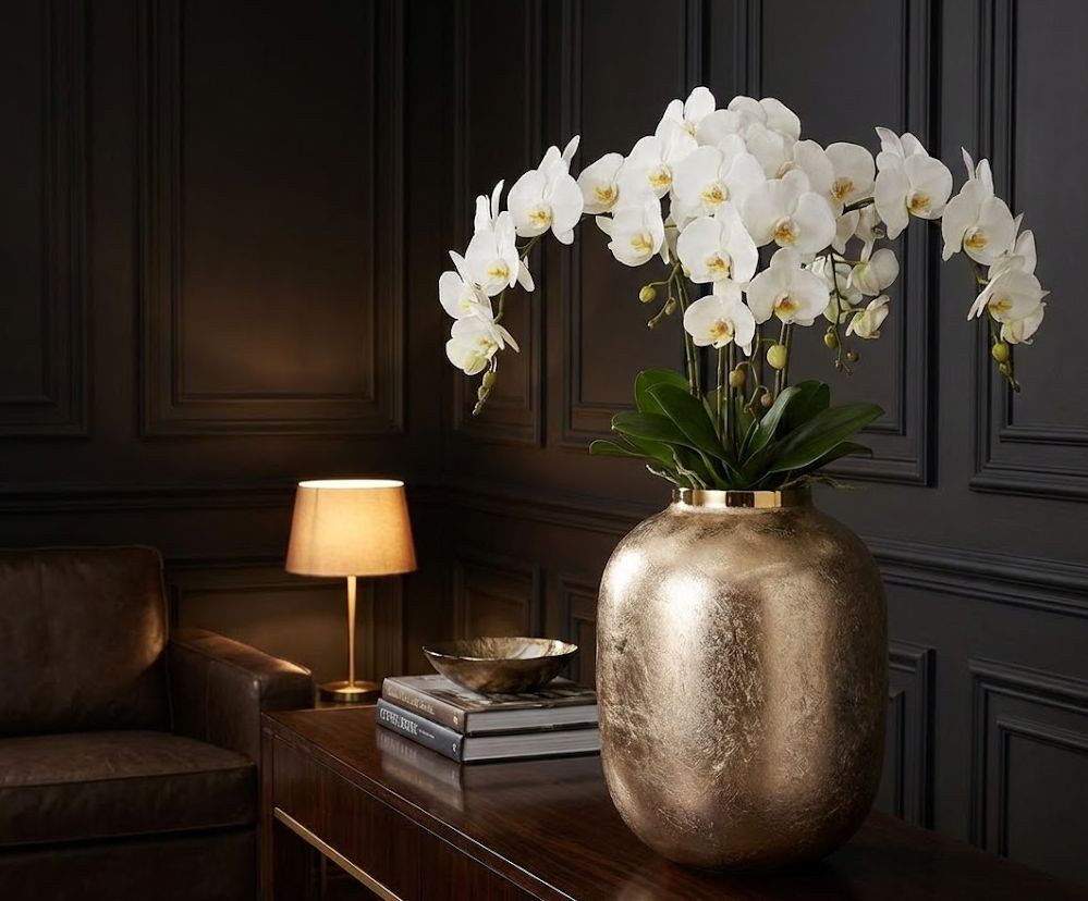 Tip pro aranžování: Zlatá váza Jullie Jolly vypadá fantasticky v kombinaci s tmavým nábytkem (černá, tmavě hnědá) nebo sametem. Pro dokonalý efekt do ní vložte bílé orchideje, sušené palmové listy nebo větvičky s červenými bobulemi během vánoční sezóny.