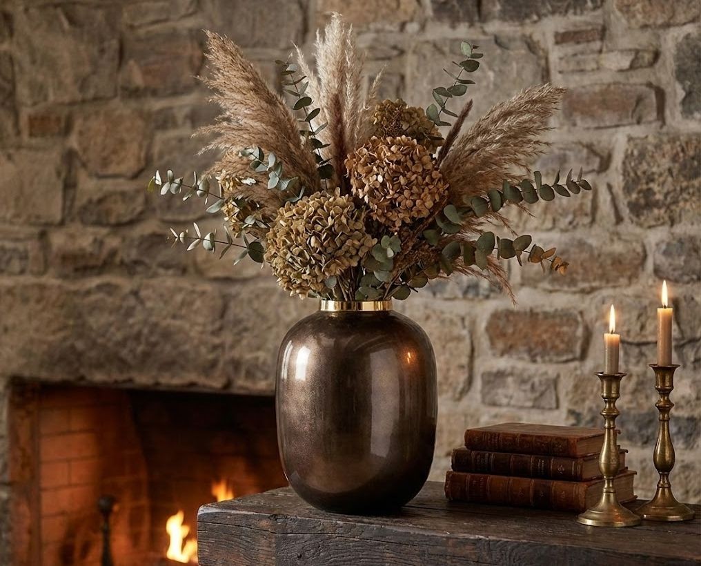 Tip pro aranžování: V této tmavé váze nádherně vyniknou světlé květiny, které vytvoří potřebný kontrast – například bílé lilie, krémové růže nebo sušená pampová tráva v přírodním odstínu. Skvěle se vyjímá na mramorové desce krbu nebo na masivním dřevěném stole.