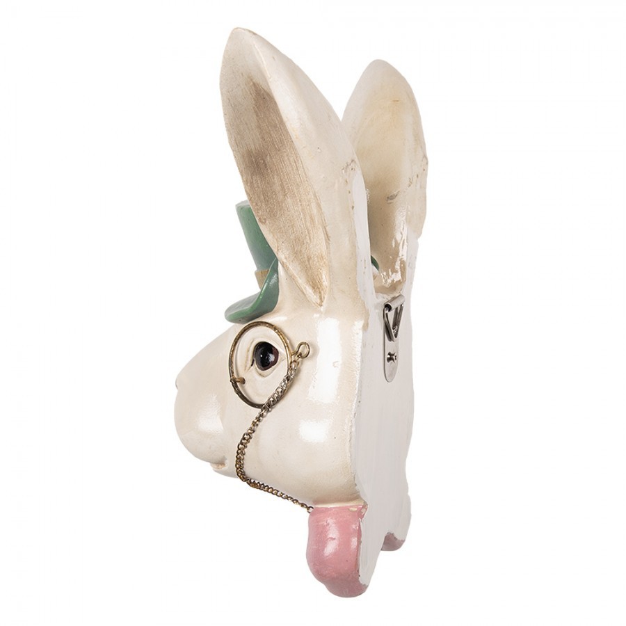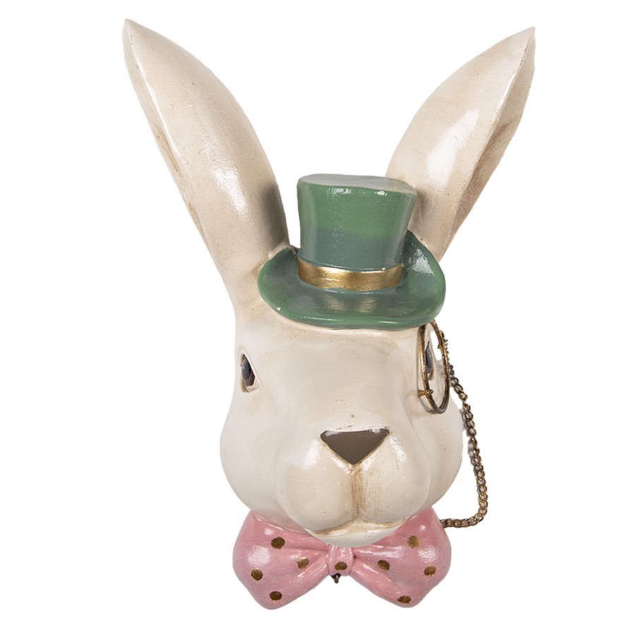 Oživte svůj interiér originální nástěnnou dekorací hlavy bílého zajíce. Elegantní králík se zeleným cylindrem, monoklem a růžovým motýlkem vnese do vašeho domova pohádkové kouzlo. Snadné zavěšení, rozměry 17x11x25 cm.