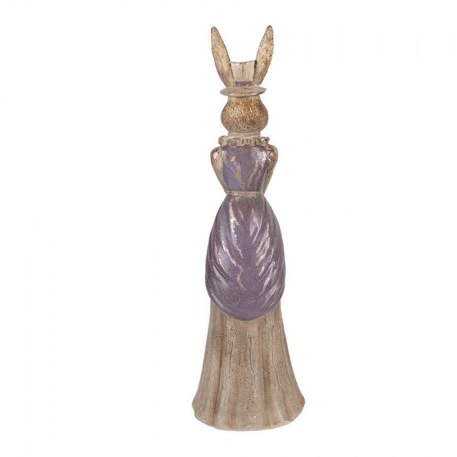 Vznešená zaječice je oblečena do dlouhé krémové sukně a fialového živůtku s jemným řasením kolem krku. V tlapkách svírá drobnou kabelku a na hlavě jí nechybí elegantní klobouček, skrz který vykukují dlouhé uši se zlatavým nádechem. Povrchová úprava s výraznou patinou jí dodává vzhled rodinného dědictví, které se předává z generace na generaci.