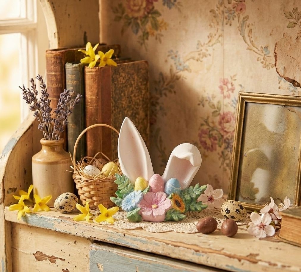 Roztomilá velikonoční dekorace v podobě králičích uší s pastelovými vajíčky a květinami. Jemný design s třpytivým nádechem pro dokonalou jarní atmosféru. Rozměr 12×9×11 cm.