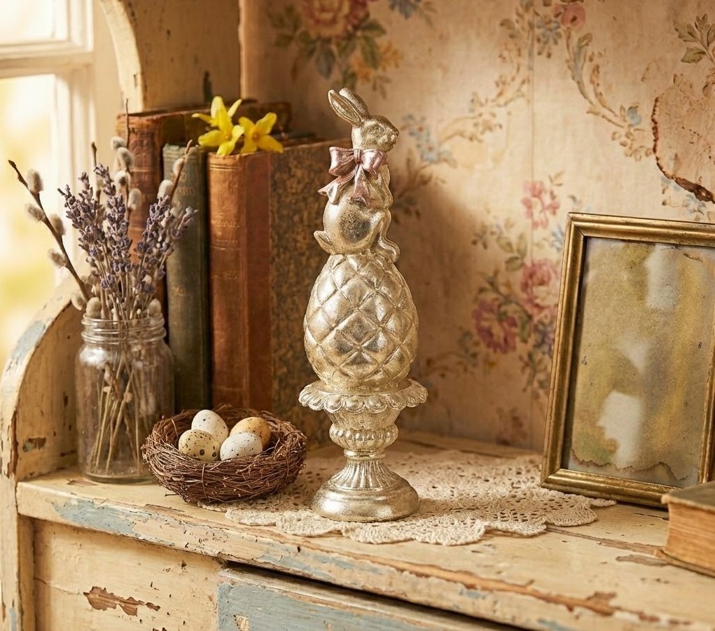 Majestátní soška o výšce 28 cm zobrazuje zajíce sedícího na velkém vajíčku, které je umístěno na ozdobném podstavci připomínajícím starožitný pohár. Celá dekorace je laděna do tlumené zlaté barvy s patinou, která jí dodává vzhled drahého kovu poznamenaného časem.
