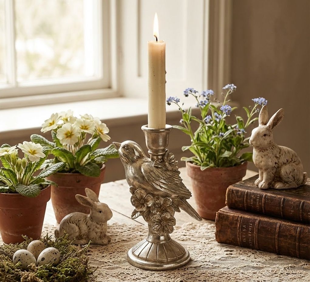 Tento dekorativní svícen na první pohled zaujme svým detailním zpracováním. Dominantou je figurka zpěvného ptáčka, který sedí na rozkvetlé větvičce. Celá kompozice slouží jako držák pro klasickou kónickou svíčku. Povrchová úprava ve stříbrné barvě s výraznou patinou imituje vzhled starožitného kovu, což dodává svícnu punc luxusu a historie.
