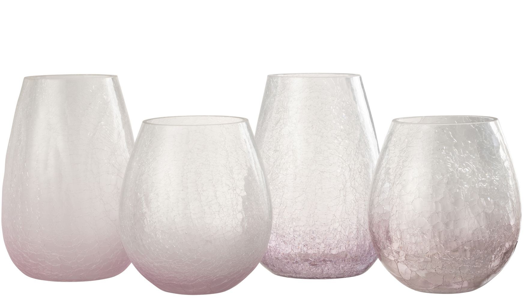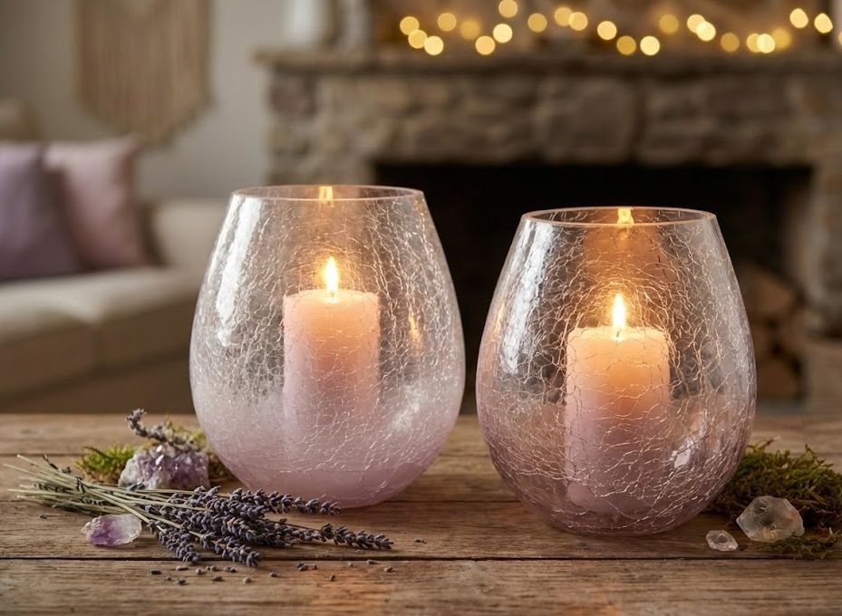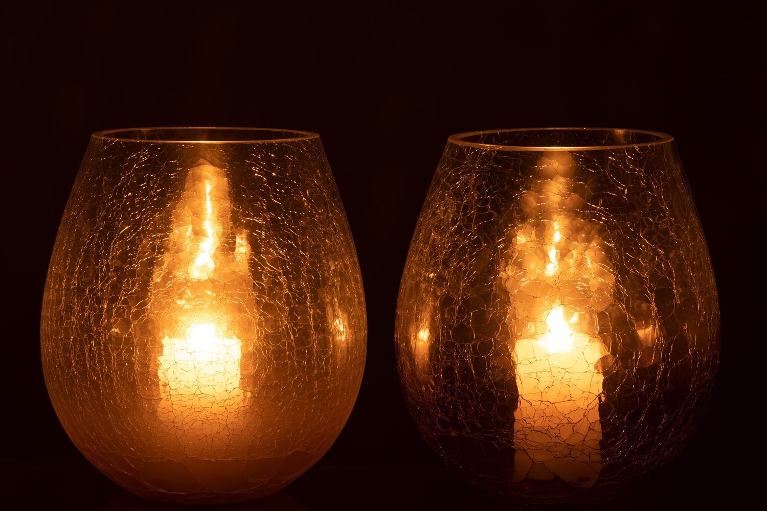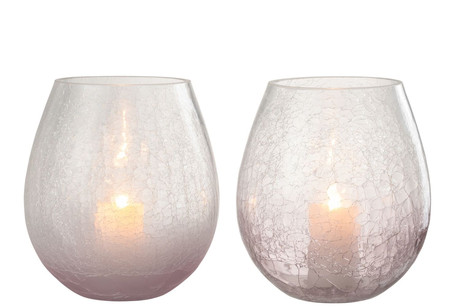 Vytvořte si doma magickou atmosféru s touto exkluzivní sadou dvou skleněných svícnů Hurricane. Jejich jedinečný povrch s efektem popraskaného ledu (krakelování) v kombinaci s jemným fialovým ombre odstínem rozehraje ve vašem interiéru úchvatnou hru světla a stínů, jakmile v nich zapálíte svíčku.