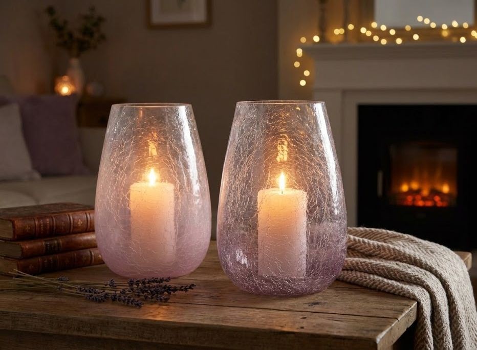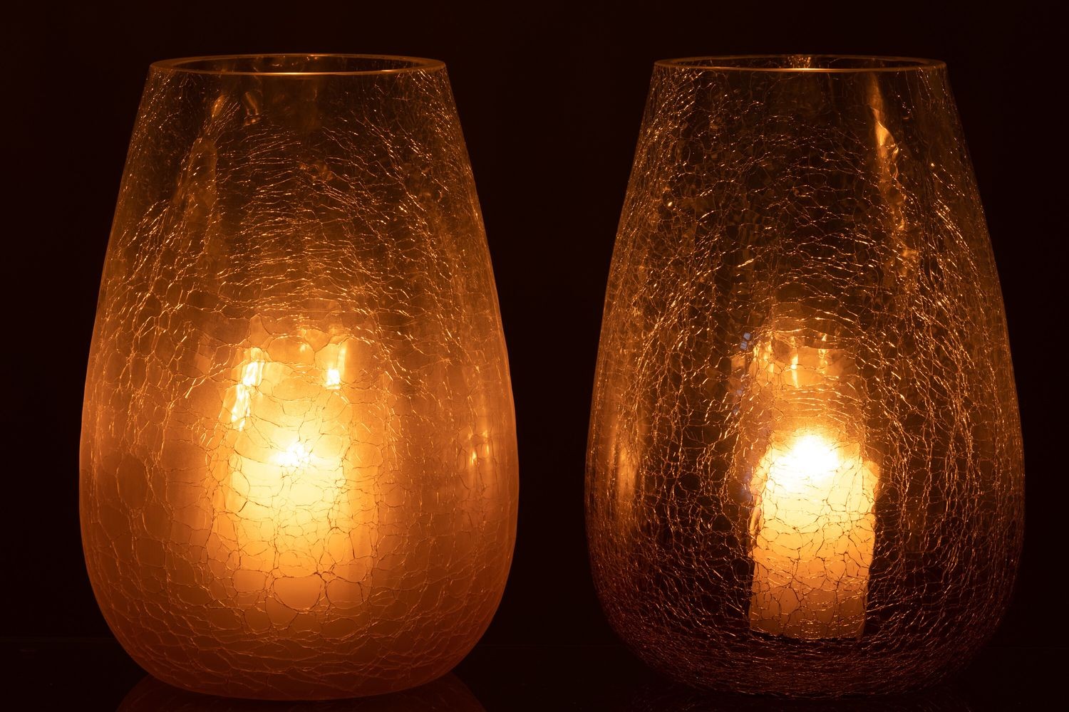 Vytvořte si doma magickou atmosféru s touto exkluzivní sadou dvou skleněných svícnů Hurricane. Jejich jedinečný povrch s efektem popraskaného ledu (krakelování) v kombinaci s jemným fialovým ombre odstínem rozehraje ve vašem interiéru úchvatnou hru světla a stínů, jakmile v nich zapálíte svíčku.
