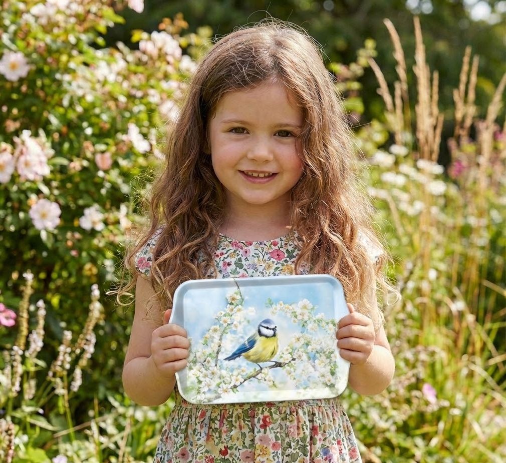 Tento okouzlující malý podnos z kolekce "Blossom" zdobí detailní, malovaná ilustrace sýkorky modřinky, která spokojeně sedí na bohatě rozkvetlé větvi bílých květů. Jemné pastelové barvy na pozadí modré oblohy vytvářejí klidnou a romantickou atmosféru, která rozzáří každý stůl.