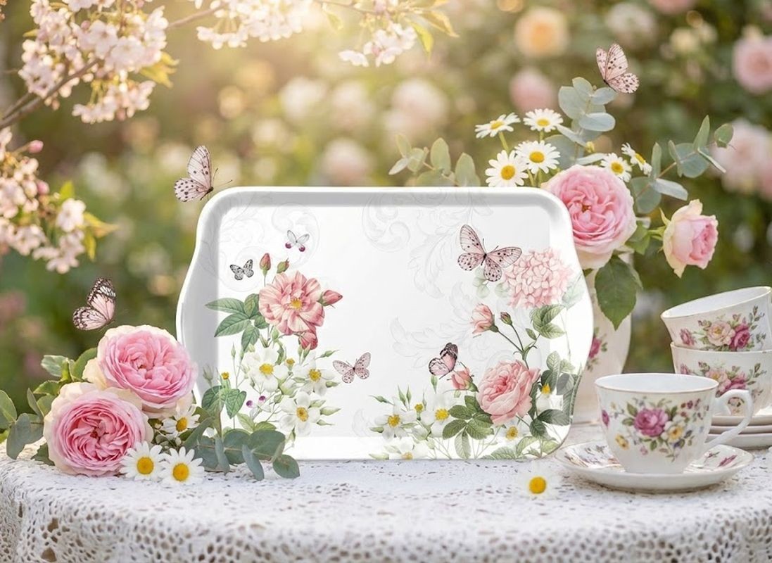 Tento jemný servírovací tácek vás na první pohled okouzlí svým něžným designem. Na sněhově bílém podkladu s decentním vodoznakem se vyjímají nádherné ilustrace růžových růží, hortenzií a drobných bílých kvítků, kolem kterých poletují křehcí motýli. Celkový dojem působí velmi elegantně, čistě a vintage stylem.