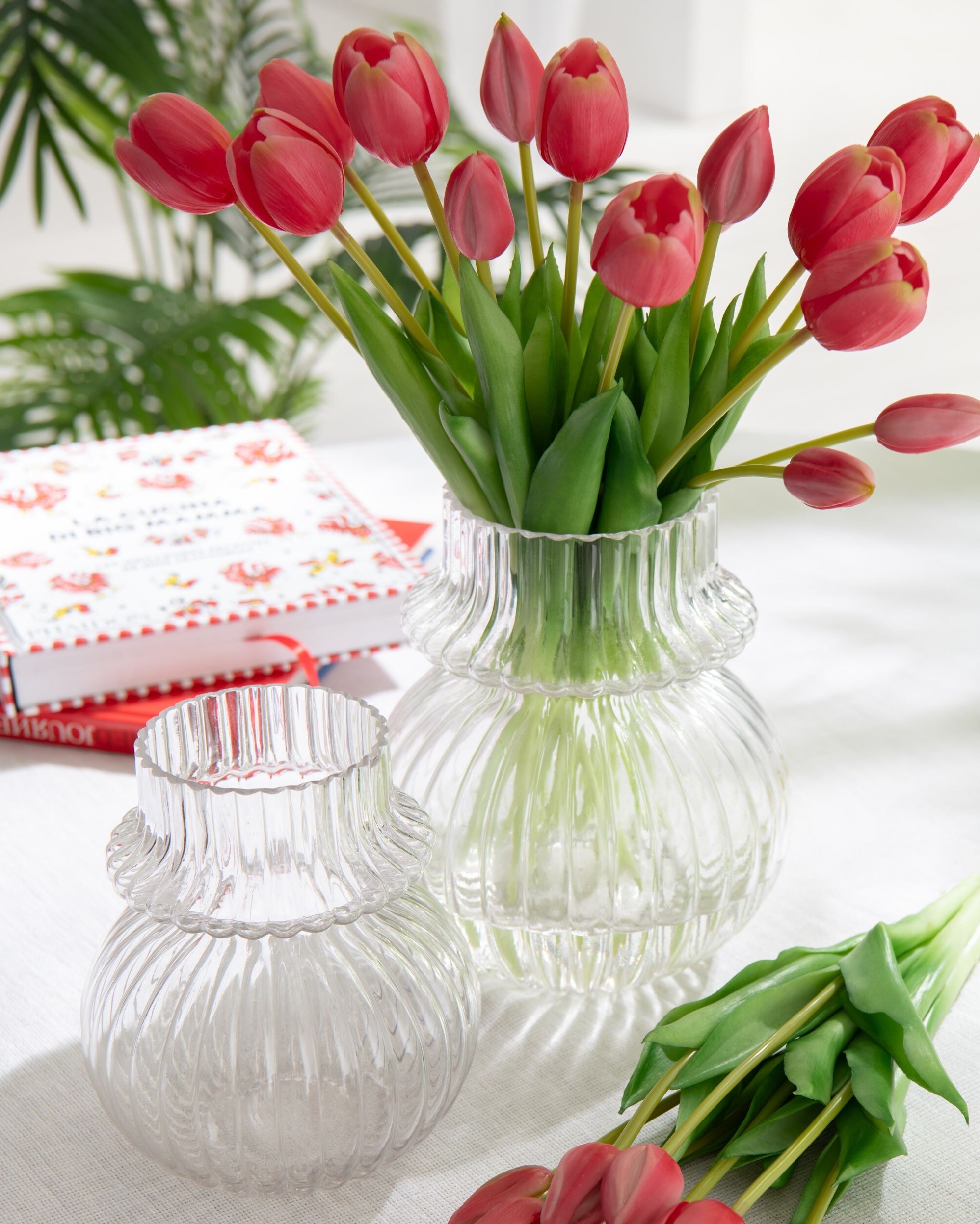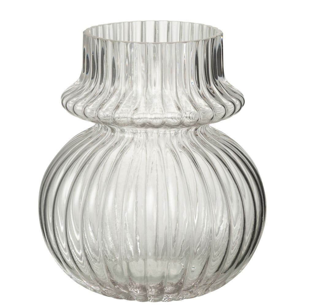 Povrch vázy zdobí pravidelné svislé žebrování (vroubkování). To dodává čirému sklu texturu a hloubku, aniž by rušilo minimalistický vzhled. Váza působí lehce, vzdušně a opticky nezmenšuje prostor, proto je ideální volbou na konferenční stolky, komody či jídelní stoly.