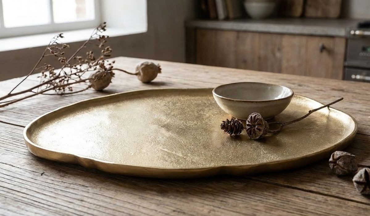 Tento podnos není jen obyčejnou podložkou, ale výrazným dekorativním prvkem. Vyznačuje se "raw" (surovým) zpracováním kovu, což znamená, že nečekejte dokonale vyleštěný zrcadlový lesk, ale spíše autentickou strukturu s jemnou patinou, která působí luxusně a zároveň útulně.