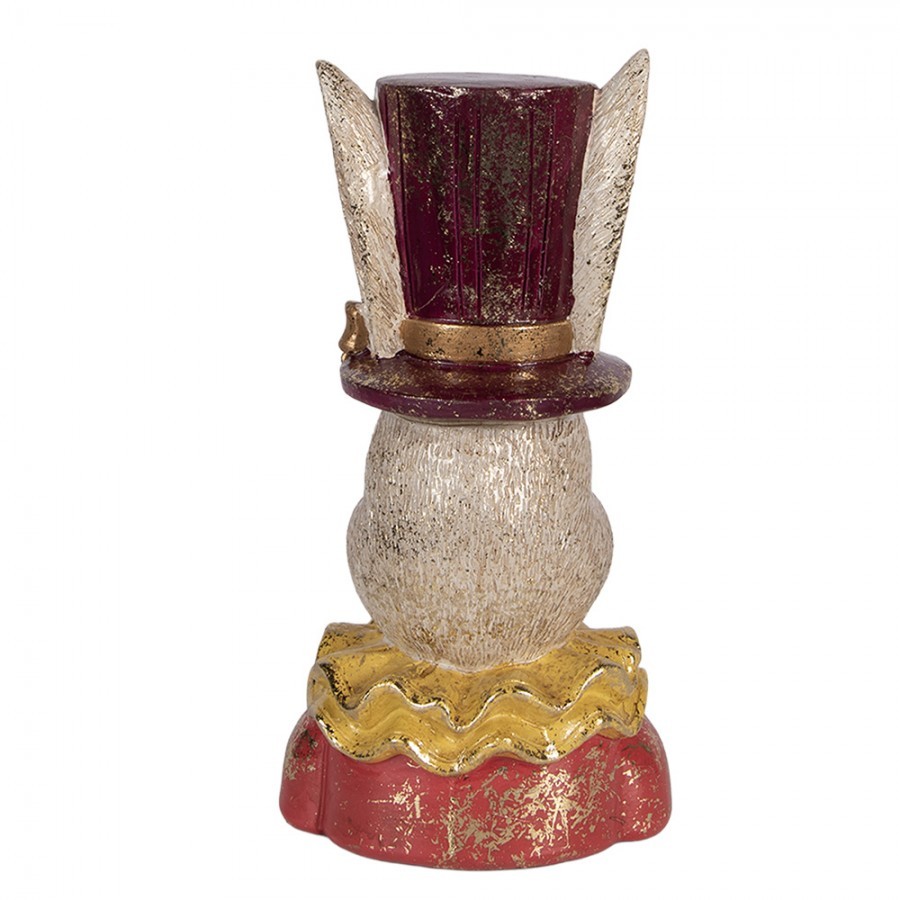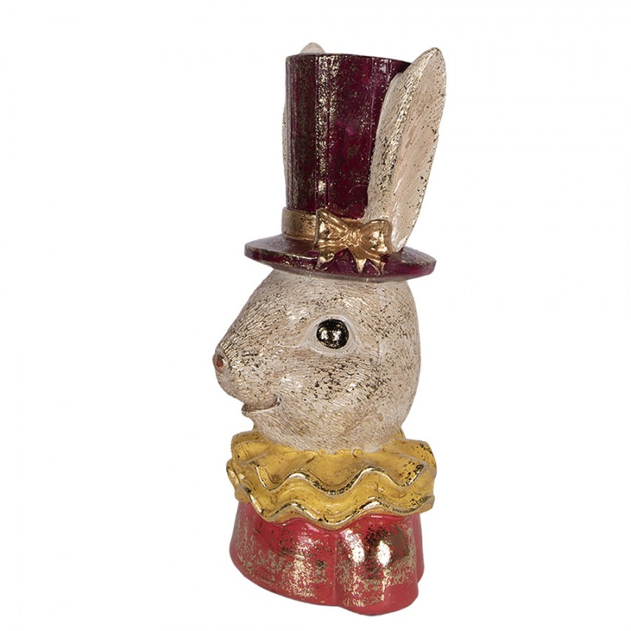Pohádková elegance s nádechem luxusu Navoďte u sebe doma atmosféru plnou fantazie. Tato detailně propracovaná busta králičice působí, jako by právě vystoupila z kouzelného příběhu. Zaječí dáma je oblečena do slavnostních červených šatů s výrazným žlutým volánovým límcem a na hlavě jí trůní vysoký vínový cylindr ozdobený roztomilou zlatou mašličkou.