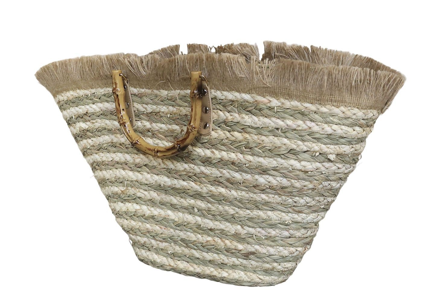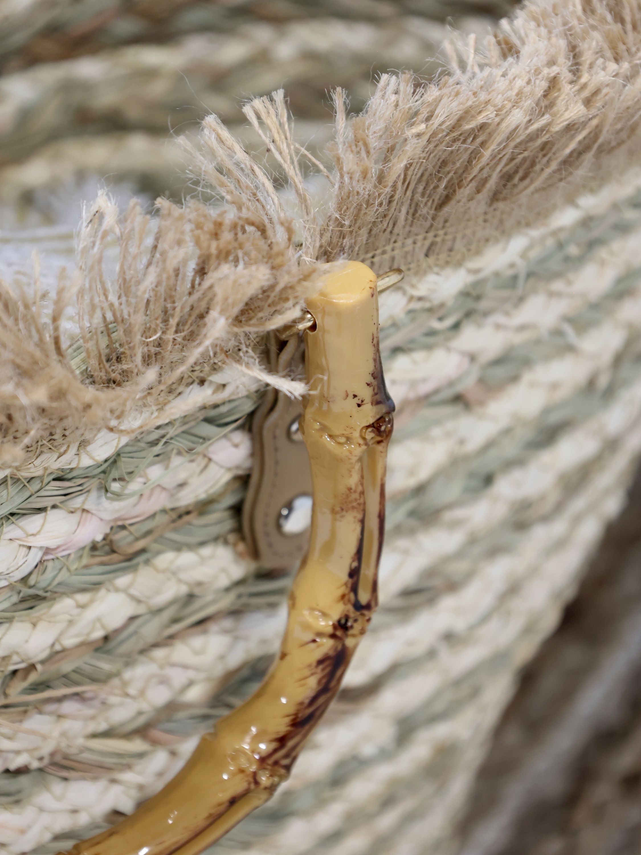 Taška zaujme na první pohled svou krásnou strukturou z přírodního materiálu. Pletený vzor kombinuje klasické přírodní béžové tóny s jemnými proužky v tlumenné barvě, což jí dodává svěží a naturální vzhled. Horní okraj je zakončen ozdobným roztřepeným lemem (třásněmi), který podtrhuje uvolněný boho styl.
