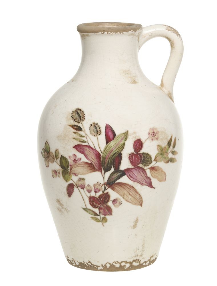 Dominantou vázy je ručně malovaný rostlinný motiv na přední straně, zobrazující směs listů a drobných květů v tlumených odstínech vínové, růžové, zelené a hnědé. Tento jemný dekor krásně koresponduje s celkovým starobylým rázem. Váza je navíc opatřena velkým praktickým ouškem, které podtrhuje její vzhled tradičního keramického džbánu.