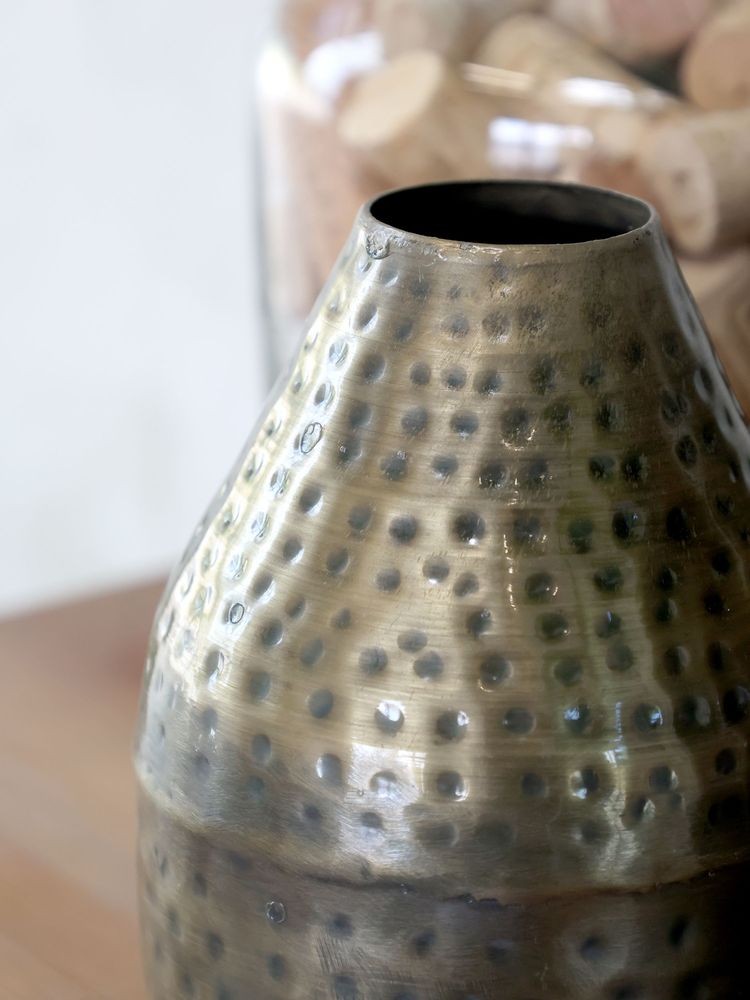 Ručně tepaný vzhled s patinou Váza je vyrobena z kovu s nádhernou povrchovou úpravou ve stylu staré mosazi či bronzu. Její povrch je po celém obvodu zdoben výrazným tepaným vzorem z drobných důlků, který jí dodává hloubku a rustikální charakter. Barevnost je jemně tónovaná, s přechodem od světlejšího, lesklejšího hrdla k tmavší, patinované spodní části, což umocňuje její autentický antik vzhled.