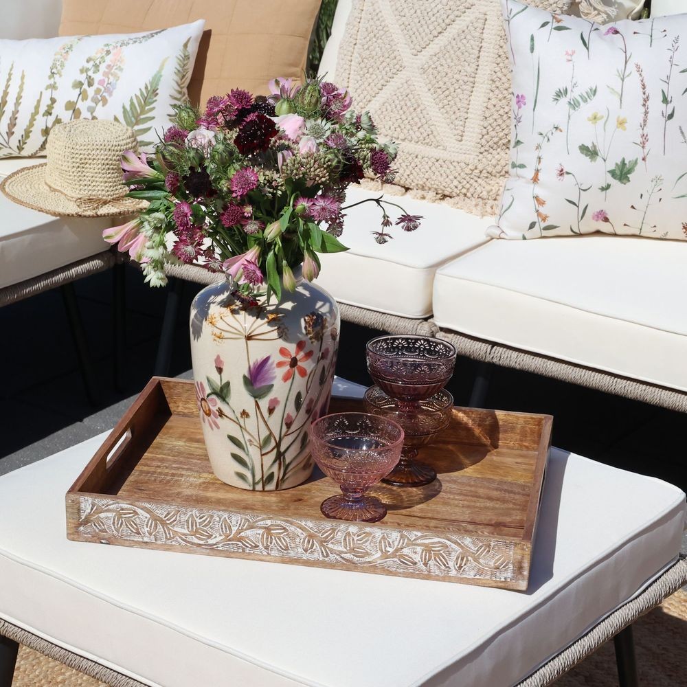 S velkorysými rozměry 59 x 35 cm nabízí tento podnos dostatek prostoru pro servírování bohaté snídaně do postele, odpolední kávy s dezerty pro hosty nebo přenášení nádobí na terasu. Díky vyvýšeným okrajům (5 cm) se nemusíte bát, že by vám něco sklouzlo. Pro snadnou manipulaci jsou v kratších bocích vyřezány dva praktické průhmatové úchyty.