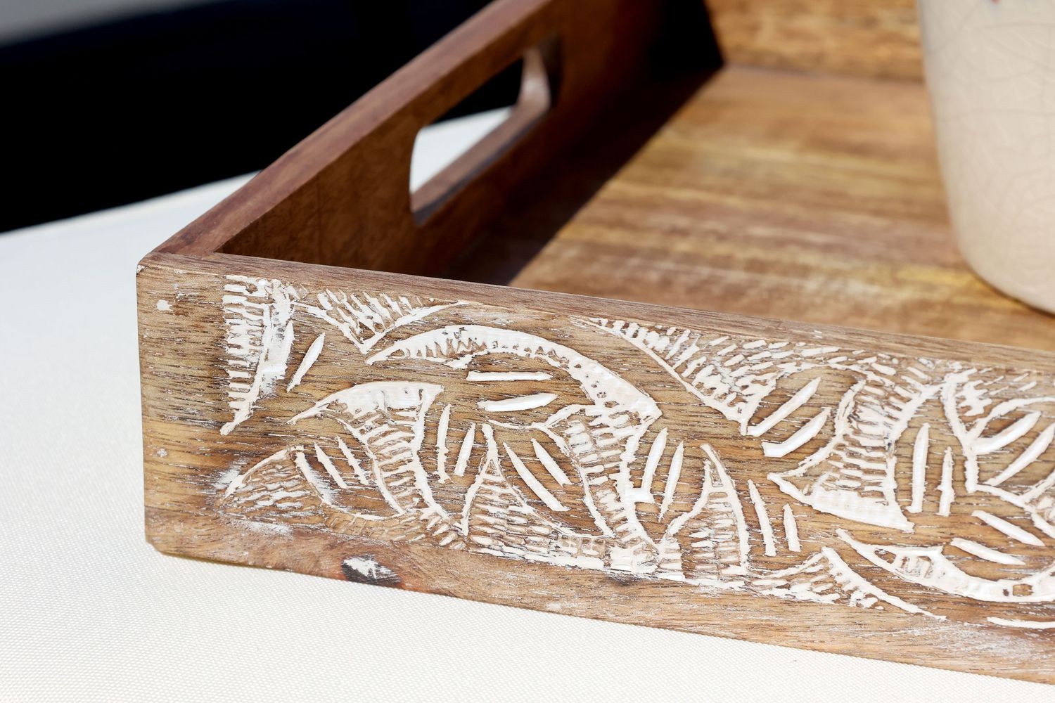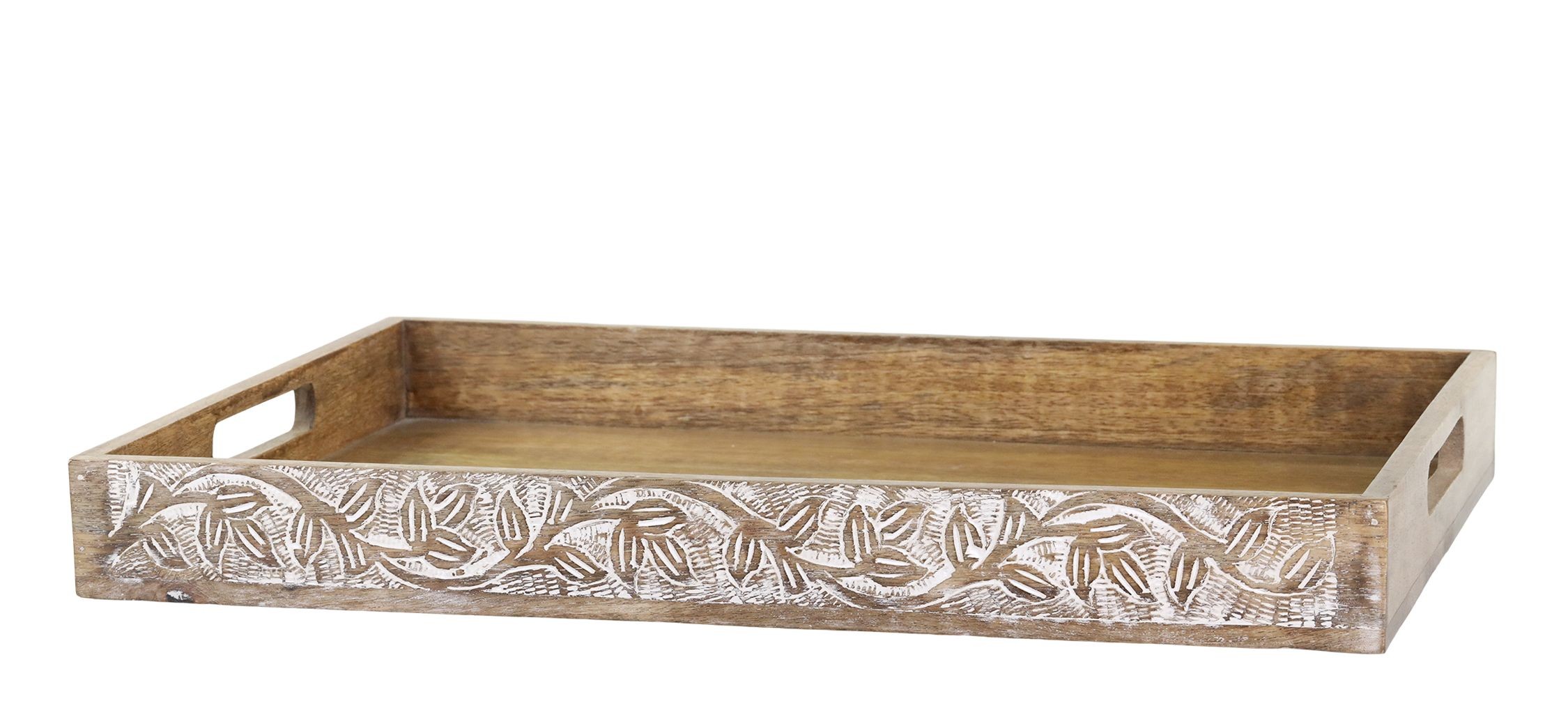 Hlavní ozdobou tohoto podnosu jsou jeho vnější delší stěny, které jsou zdobeny detailní reliéfní řezbou s motivy listů a větviček. Tato řezba je zvýrazněna bílou patinou, která krásně kontrastuje s teplým odstínem přírodního dřeva a dodává podnosu starobylý, omšelý šarm.