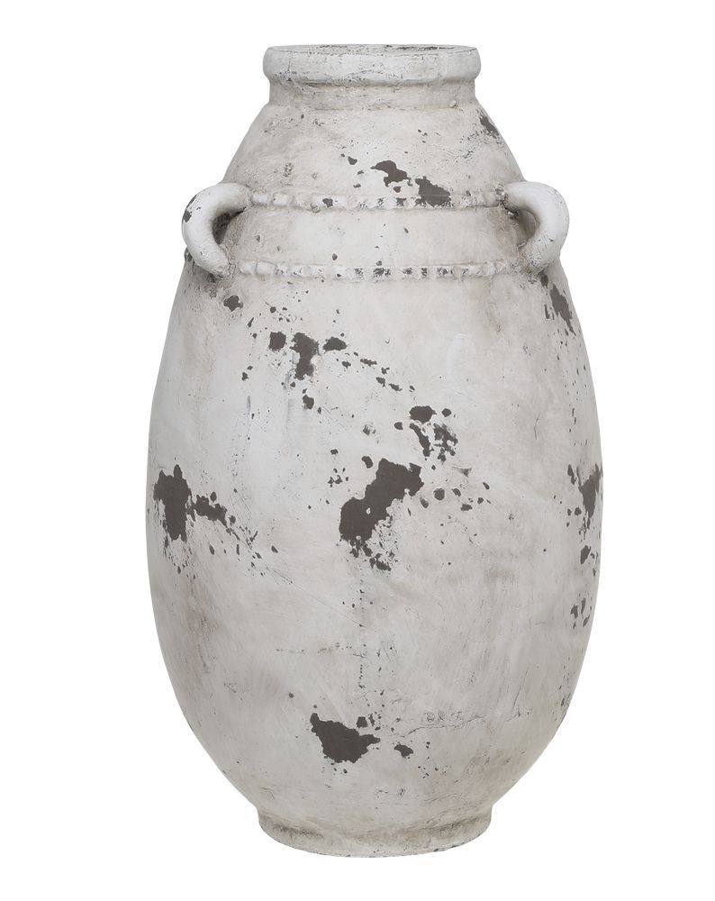 Terakotová váza Frejus není jen obyčejnou nádobou, ale skutečným designovým kouskem s duší. Její povrch zdobí záměrně nedokonalá, oprýskaná bílo-šedá povrchová úprava, která odhaluje tmavý podklad. Právě tato autentická antik patina dodává váze vzhled historického artefaktu, který jako by byl objeven na starém toskánském panství.