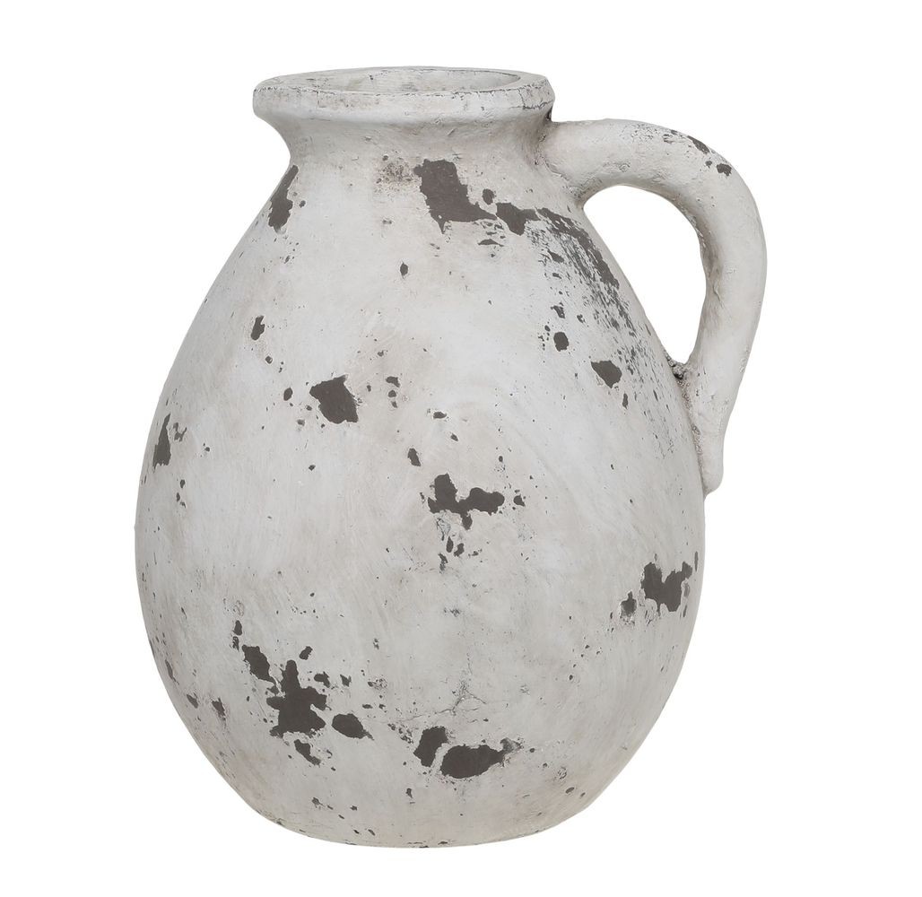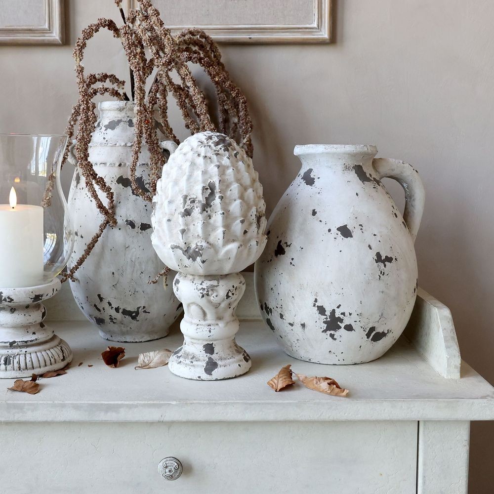 Terakotová váza Frejus není jen obyčejnou nádobou, ale skutečným designovým kouskem s duší. Její povrch zdobí záměrně nedokonalá, oprýskaná bílo-šedá povrchová úprava, která odhaluje tmavý podklad. Právě tato autentická antik patina dodává váze vzhled historického artefaktu, který jako by byl objeven na starém toskánském panství.