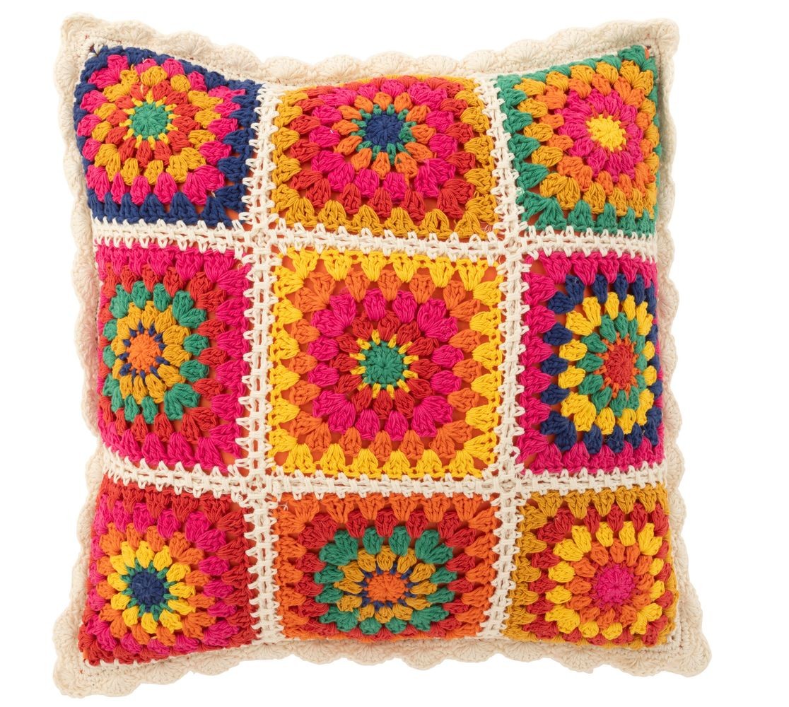 Přední stranu polštáře zdobí ikonický vzor poskládaný z pestrých háčkovaných čtverců (tzv. "granny squares"). Nádherná kombinace zářivých odstínů – fuchsiové, oranžové, tyrkysové, žluté a tmavě modré – tvoří nepřehlédnutelnou mozaiku. Celý design je jemně orámován a spojen krémovou přízí, která přechází do elegantního vlnkovaného lemu po celém obvodu.