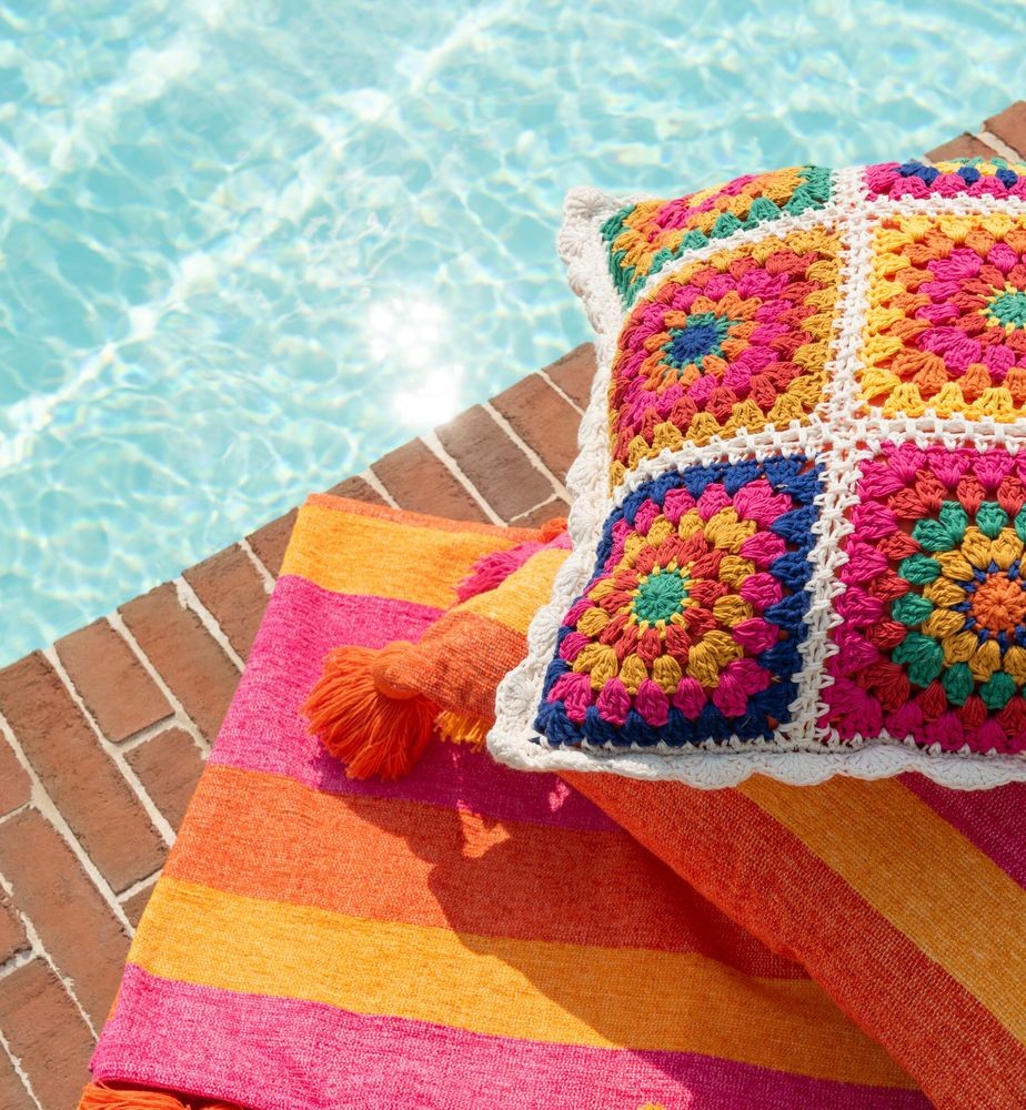 Vdechněte svému domovu, letní terase nebo posezení u bazénu nespoutanou energii! Tento nádherný dekorativní polštář v oblíbeném boho a retro stylu okamžitě rozzáří každý prostor a dodá mu uvolněnou, prázdninovou atmosféru.