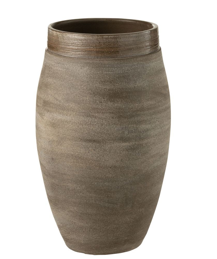 Vneste do svého domova harmonii a klid s keramickou vázou Gio Refuge. Tato váza na první pohled zaujme svou organickou siluetou a specifickou antik povrchovou úpravou. Tělo vázy zdobí jemná horizontální textura v prolínajících se zemitých, šedohnědých odstínech, která evokuje tradiční ruční hrnčířskou práci. Vrchní okraj je zakončen kontrastní, tmavší a mírně lesklou glazurou, jež celému kousku dodává punc sofistikovanosti.