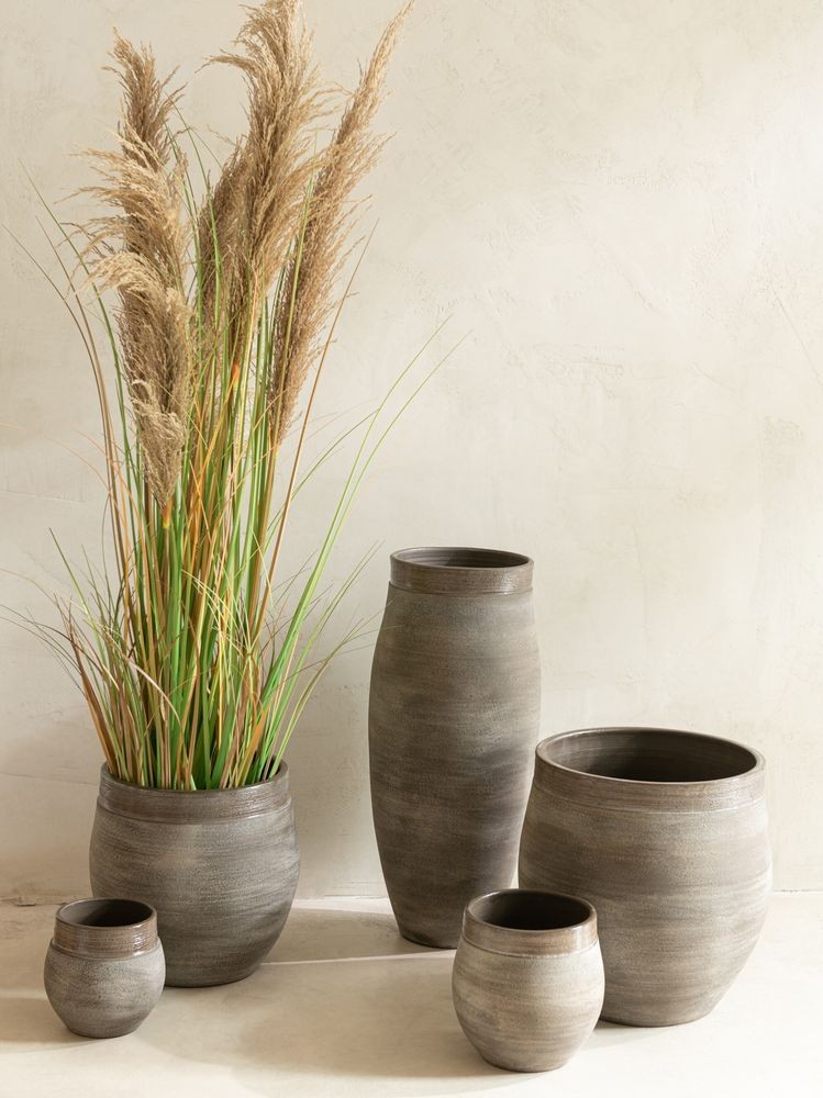 Tip pro styling: Jak můžete vidět na inspirativní fotografii, obal na květináč Gio Refuge vypadá naprosto skvěle v kombinaci s dalšími vázami ze stejné kolekce. Vytvořte si v obývacím pokoji nebo hale stylové zátiší v duchu wabi-sabi a doplňte ho abstraktním obrazem v neutrálních barvách.
