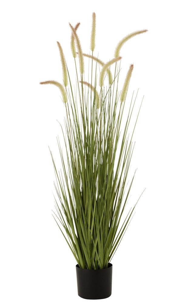 Rostlina se pyšní bohatým trsem úzkých, realisticky tónovaných zelených listů, ze kterých raší elegantní, světlé laty (klasy). Ty dodávají celé dekoraci lehkost a jemnou texturu. Tráva je bezpečně ukotvena v jednoduchém černém plastovém květináči, který slouží jako perfektní základna.