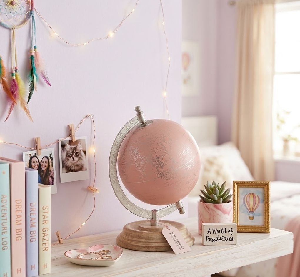 Tip pro zútulnění domova: Umístěte glóbus na poličku vedle vašich oblíbených cestopisů, svíček nebo rámečků s fotkami z dovolené. Růžová barva nádherně vynikne v moderních i skandinávsky laděných interiérech, obzvlášť v kombinaci s bílým, šedým nebo zlatým vybavením.