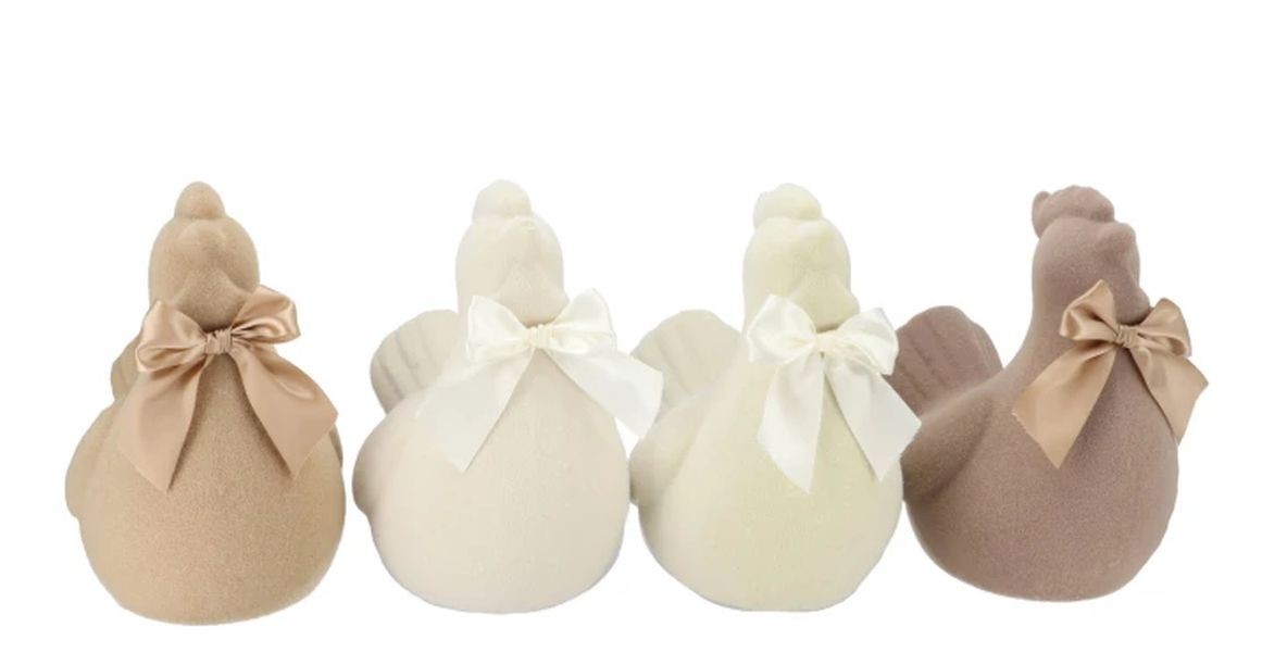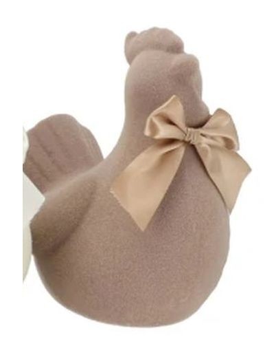 Tato soška není jen tak obyčejnou dekorací. Pyšní se speciálním "flockovaným" povrchem, který na dotek i na pohled připomíná jemný samet. Celý design je dotažen k dokonalosti sladěnou saténovou mašlí uvázanou kolem krku, která slepičce dodává roztomilý, ale zároveň velmi elegantní a vkusný vzhled.