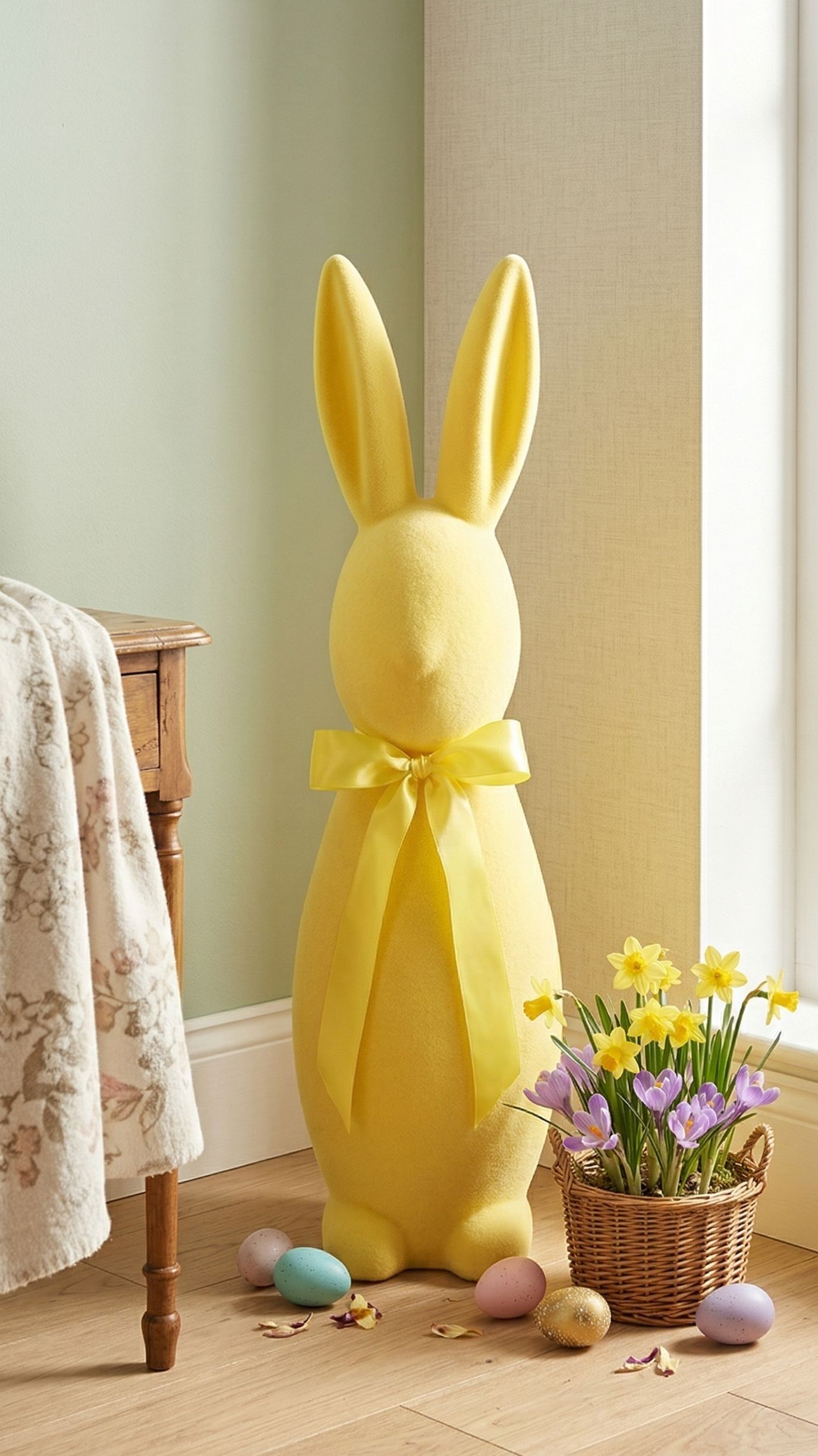 Zajíček je ozdoben luxusní saténovou mašlí, která mu dodává na roztomilosti a šmrncu. Je ideální jako výrazná stojací dekorace – perfektně vynikne v prostorné chodbě, vedle krbu v obývacím pokoji, u francouzského okna nebo v krytém vstupu do domu.