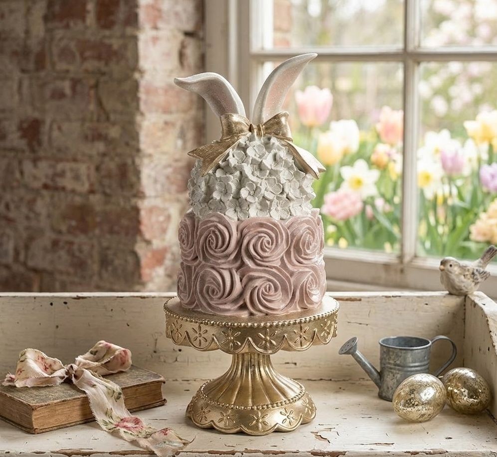 Hledáte dekoraci, která je elegantní, něžná a zároveň nese hravý symbol Velikonoc? Tento nádherný dekorativní dort na podstavci je přesně tím pravým kouskem, který vnese do vašeho domova romantickou jarní atmosféru.