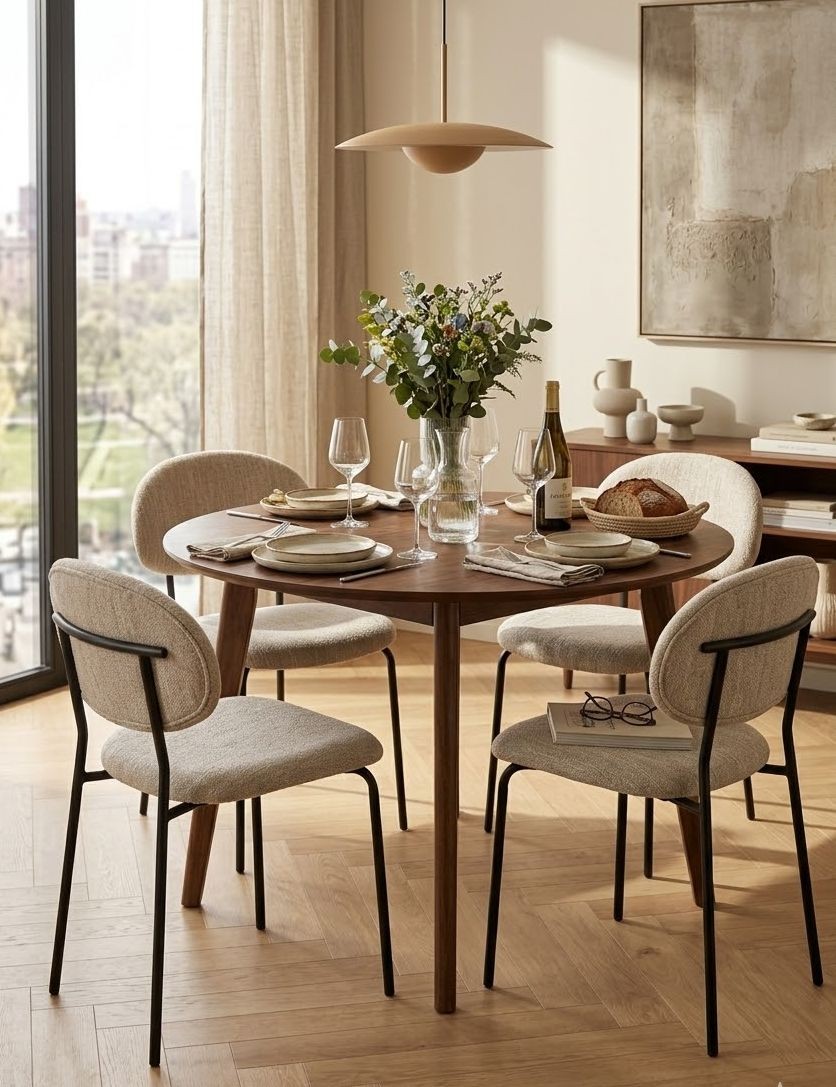 Židle na první pohled zaujme svým organickým, zaobleným tvarem opěradla a měkkým sedákem. Je čalouněna příjemnou, texturovanou látkou v teplém béžovém odstínu, která do interiéru vnese pocit klidu a domova. Tento neutrální tón se skvěle kombinuje s různými typy stolů a stylem bydlení – od skandinávského přes moderní až po boho.