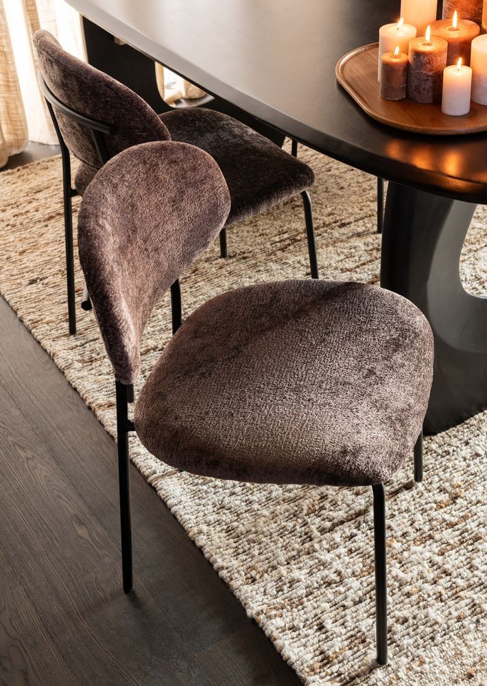 Židle na první pohled zaujme svým organickým, zaobleným tvarem opěradla a měkkým sedákem. Je čalouněna příjemnou, texturovanou látkou s viditelnou strukturou v bohaté hnědé barvě, která do interiéru vnese teplo a pocit klidu. Tento neutrální, ale výrazný tón se skvěle kombinuje s různými typy stolů a stylem bydlení – od skandinávského přes industriální až po boho chic.