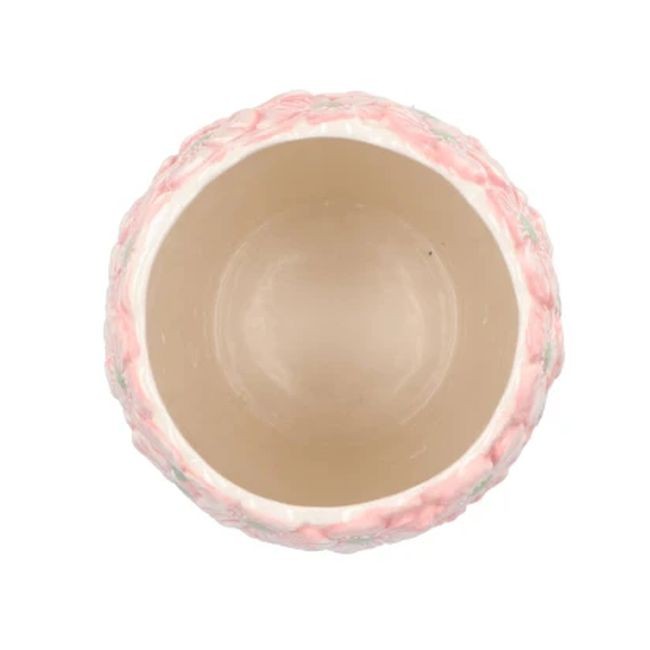 Bohatý květinový reliéf: Horní okraj vázy je obklopen hustým, detailně propracovaným 3D reliéfem rozkvetlých růžových květů s jemnými zelenými středy. Tento pás květů (připomínajících malé sasanky nebo kopretiny) vytváří dojem právě utržené a naaranžované kytice.