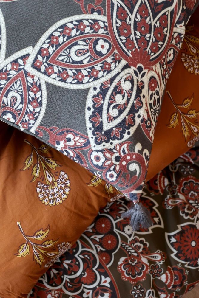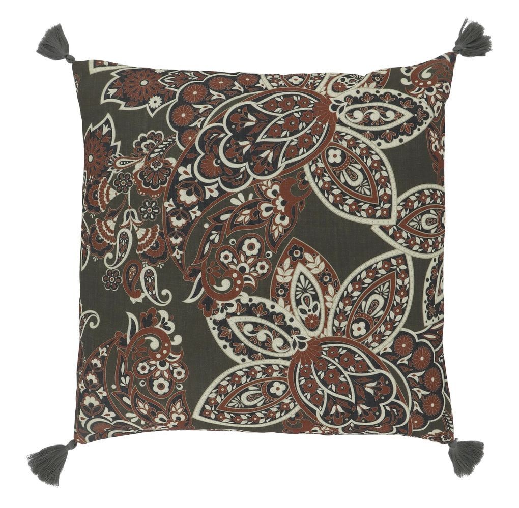 Vneste do svého obývacího pokoje nebo ložnice dotek orientální exotiky a nespoutaného boho stylu. Tento dekorační povlak na polštář z kolekce Aix Quilt na první pohled upoutá pozornost bohatým a propracovaným Paisley vzorem. Tradiční slzičkový motiv v zemitých odstínech terakoty, krémové a tmavě modré nádherně vyniká na tmavém, olivově zeleném podkladu.