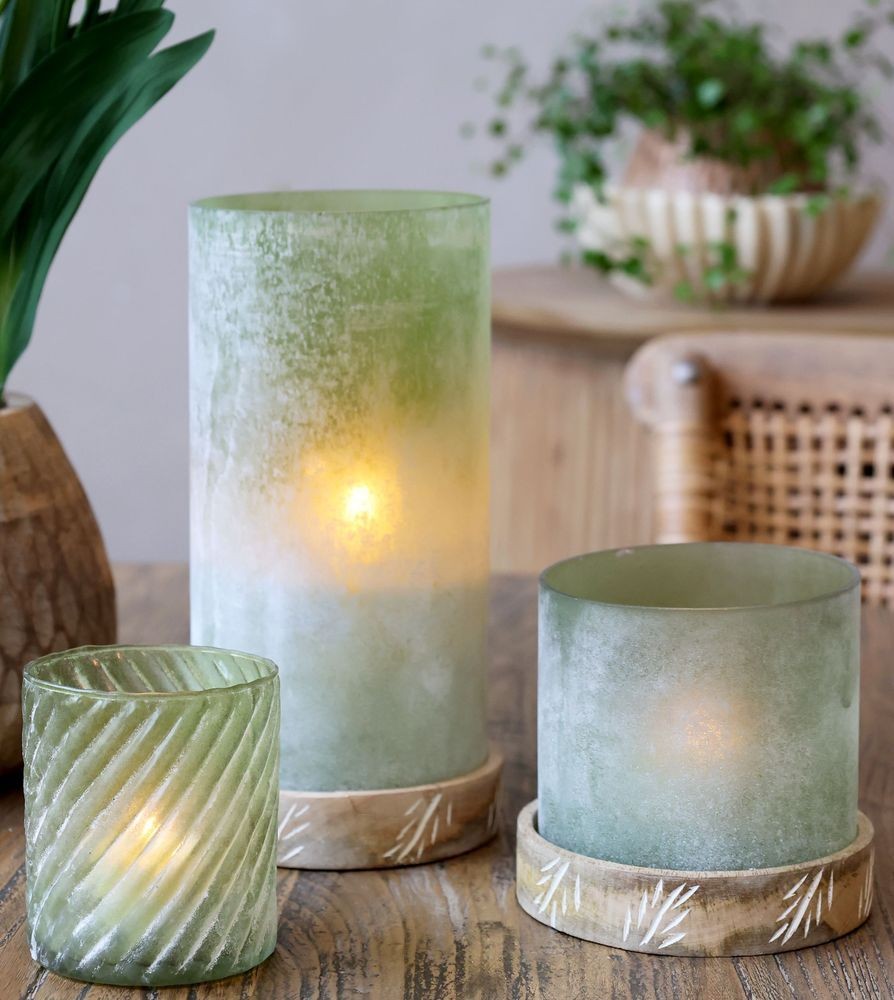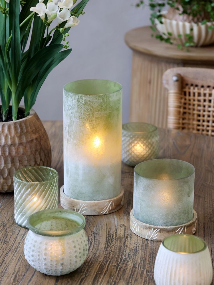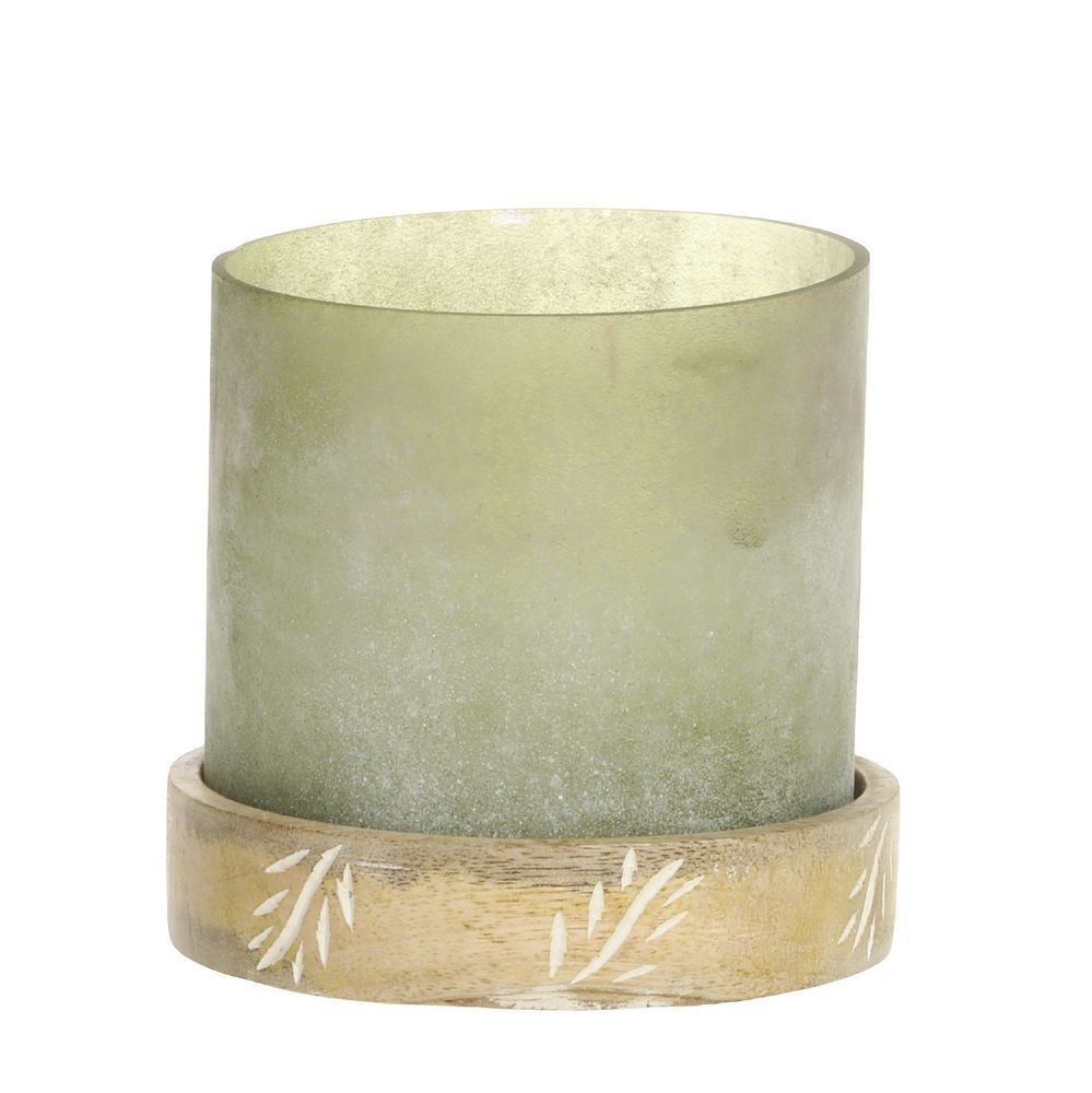 Cylindrická část z matného (pískovaného) skla v jemném zelenkavém odstínu tlumí ostrý plamen a propouští do místnosti krásně rozptýlené, tlumené světlo. Pevně sedí v rustikálním podstavci z masivního mangového dřeva, který je po obvodu zdobený jemným, ručně vyřezávaným motivem lístků zvýrazněným bílou barvou. Svícen je navržen tak, aby perfektně pojal klasické čajové svíčky nebo menší válcové svíčky.