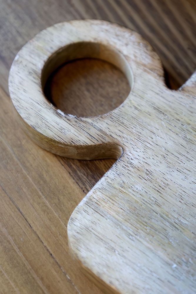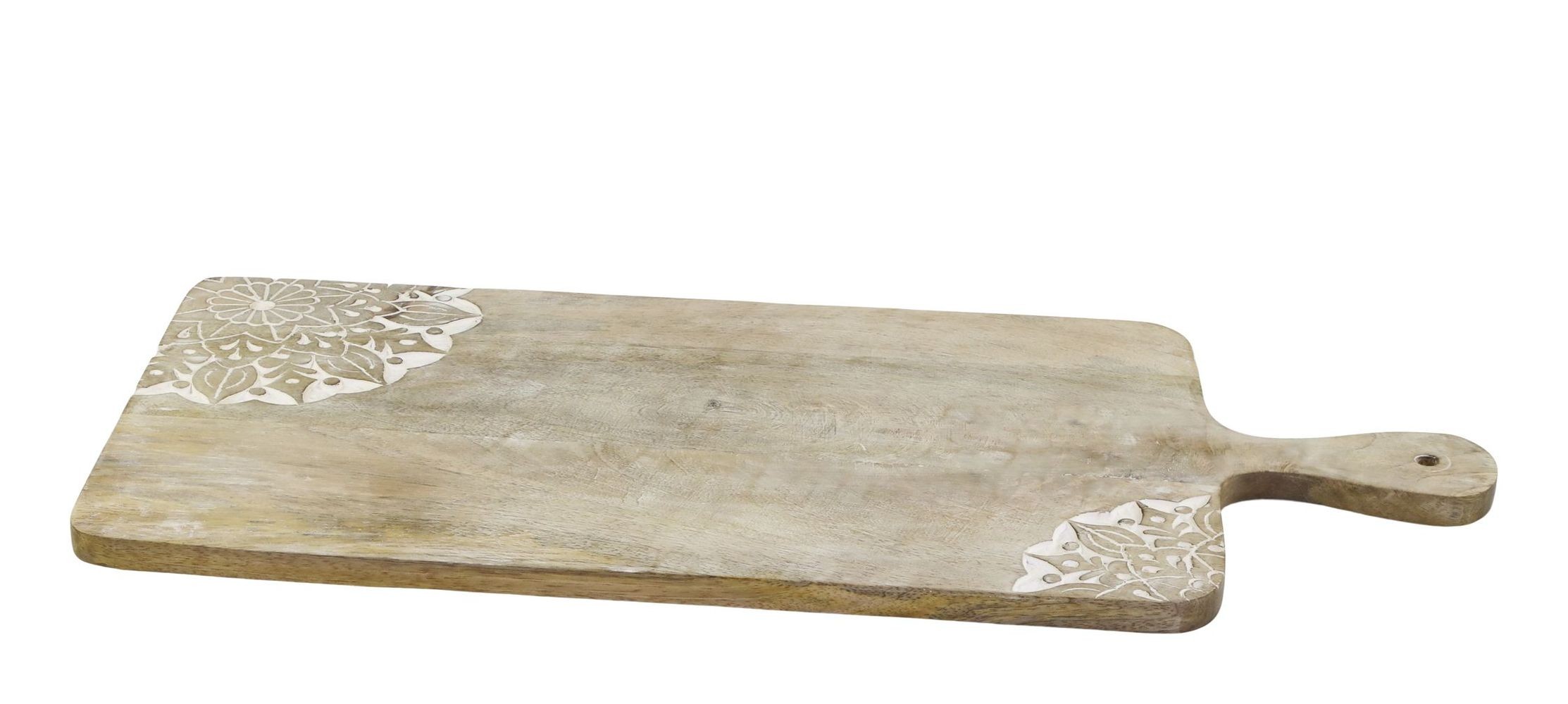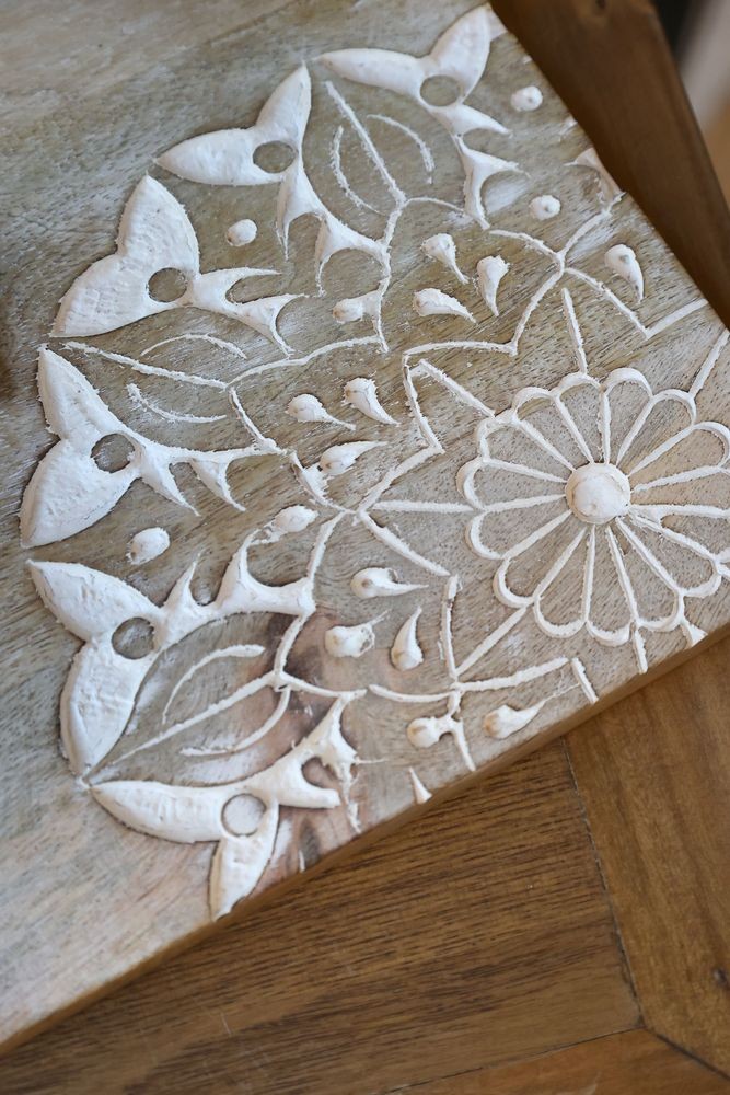 Stejně jako menší varianta z této řady je i tento kousek uměleckým dílem. Plochu prkénka zdobí v rozích detailní, ručně vyřezávané ornamenty, jejichž krásu podtrhuje jemná bílá patina. Tento designový prvek dodává masivnímu dřevu odlehčený, romantický nádech v oblíbeném boho a rustikálním stylu.