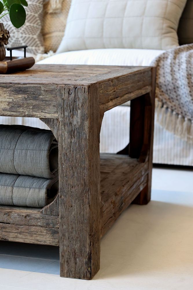 Stůl zaujme nejen svým autentickým vintage designem, ale také velkorysou spodní policí. Ta nabízí ideální prostor pro stylové uložení plédů, polštářů, košíků nebo rozečtených knih. Vrchní deska tak zůstane vždy volná pro odpolední kávu, vázu s květinami nebo hřejivé plápolající svíčky. Velkou předností tohoto kousku je jeho materiál – je vyroben z recyklovaného dřeva, díky čemuž má nezaměnitelnou strukturu, jedinečnou patinu a vlastní příběh.
