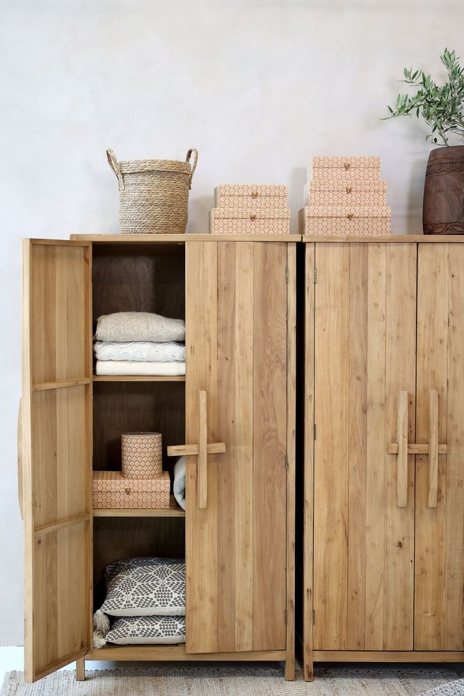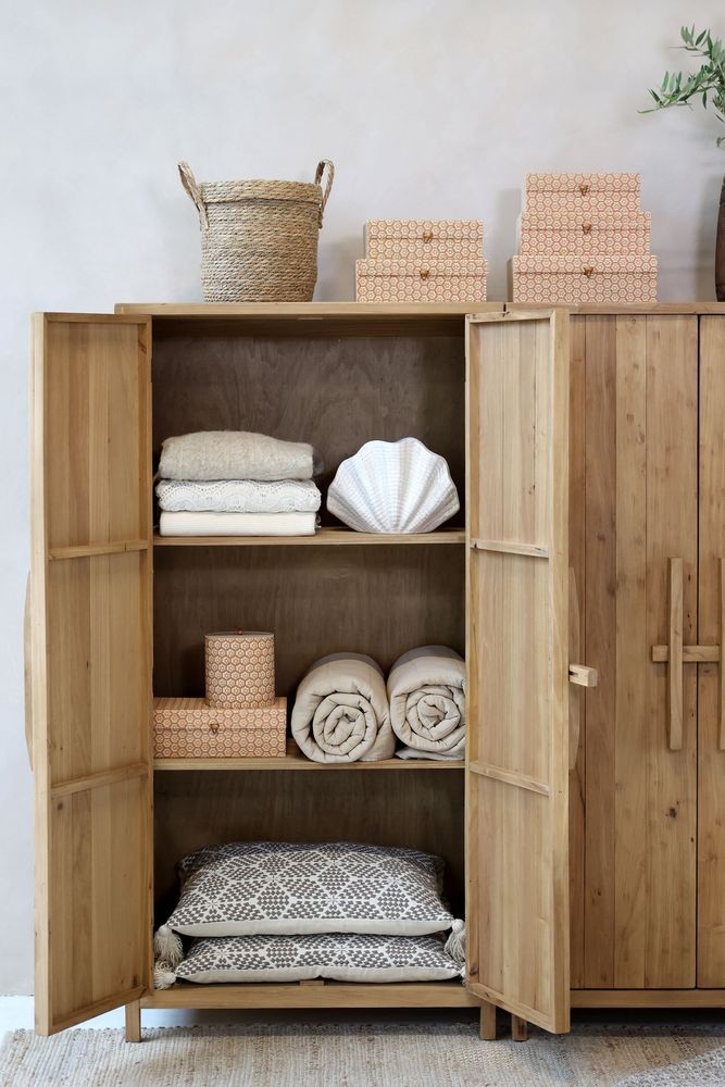 Skříň Chennia vypadá úžasně, když je naaranžována. Horní polici doplňte o proutěný koš nebo vzorované krabice. Otevřená dvířka odhalí vaši sbírku lněných textilií nebo oblíbených dekorací. Její surový povrch krásně kontrastuje s jemnějšími doplňky a rostlinami, jako je například olivovník.