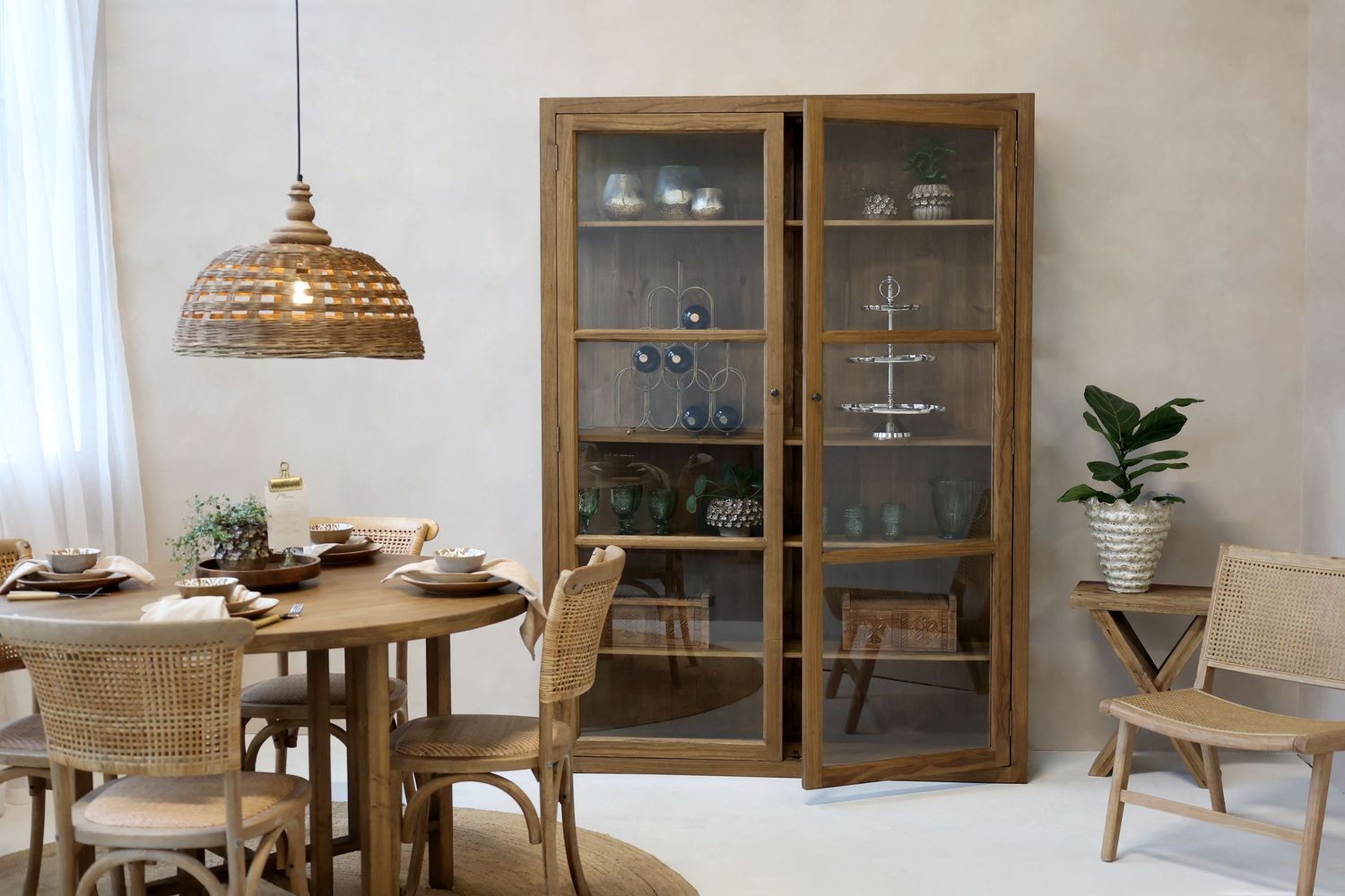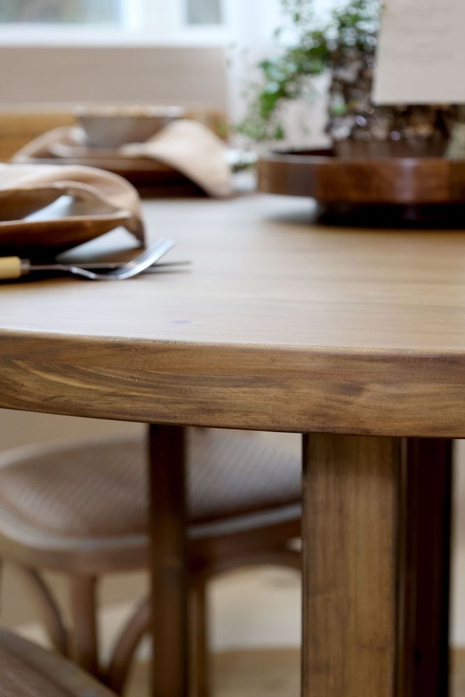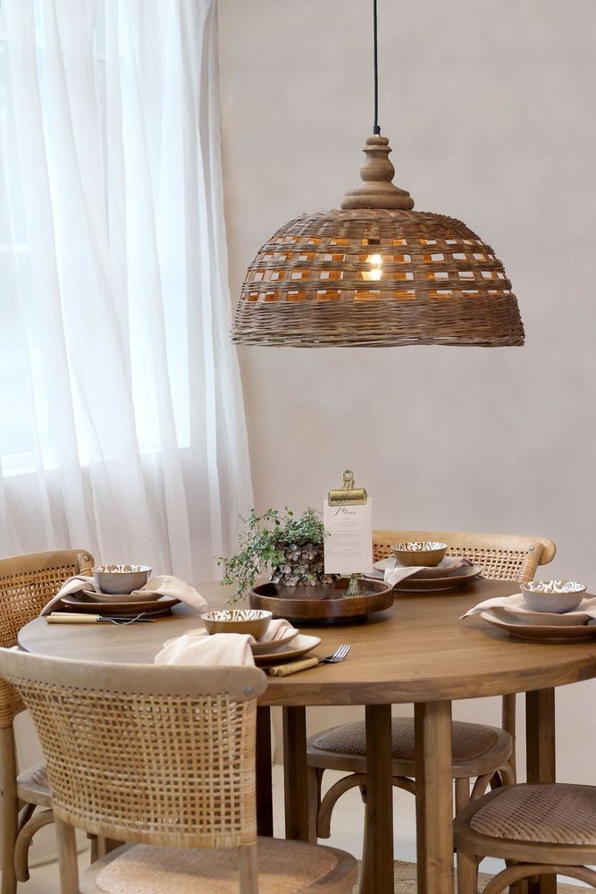 Inspirujte se naší vizualizací! Stůl Franne fantasticky rezonuje s dalšími přírodními texturami. Doplňte ho dřevěnými židlemi s vídeňským výpletem a celý jídelní kout ukotvěte velkým kulatým jutovým kobercem, který zopakuje tvar stolu. Nad střed stolu zavěste výrazný ratanový nebo proutěný lustr. Při prostírání vsaďte na vrstvení – keramické nádobí v zemitých tónech a lněné ubrousky dotáhnou styling k dokonalosti.