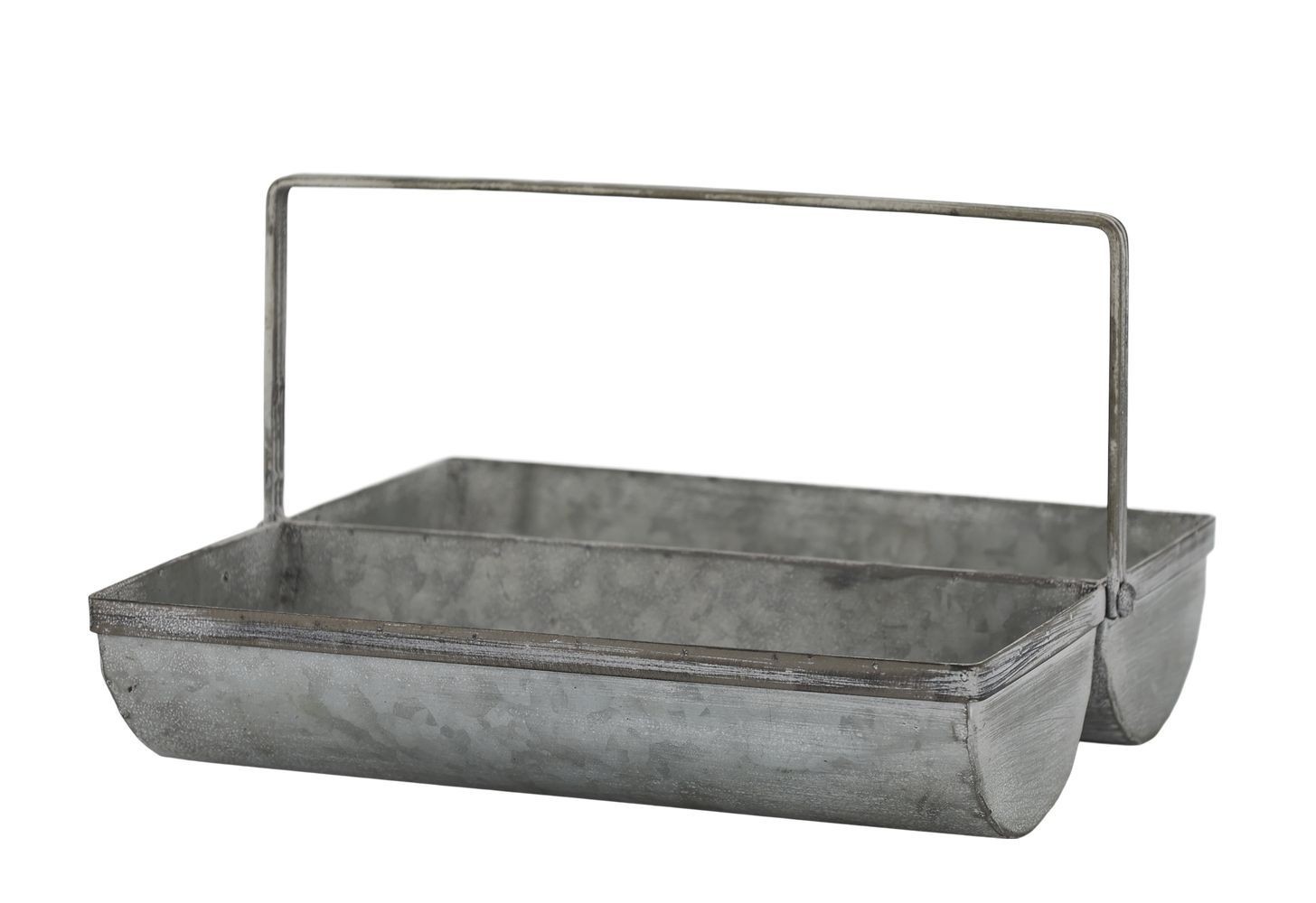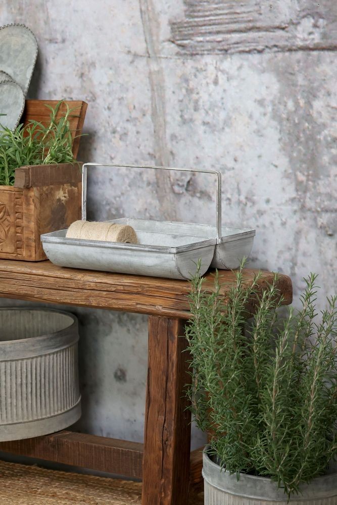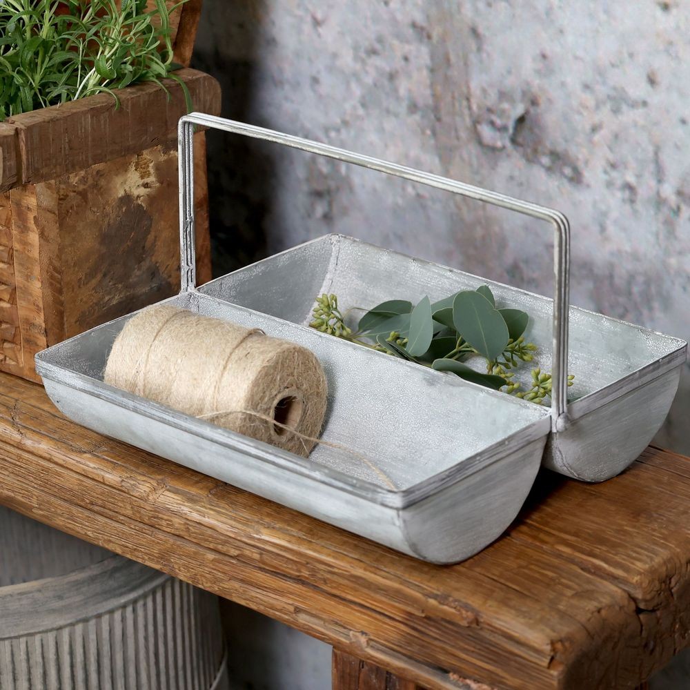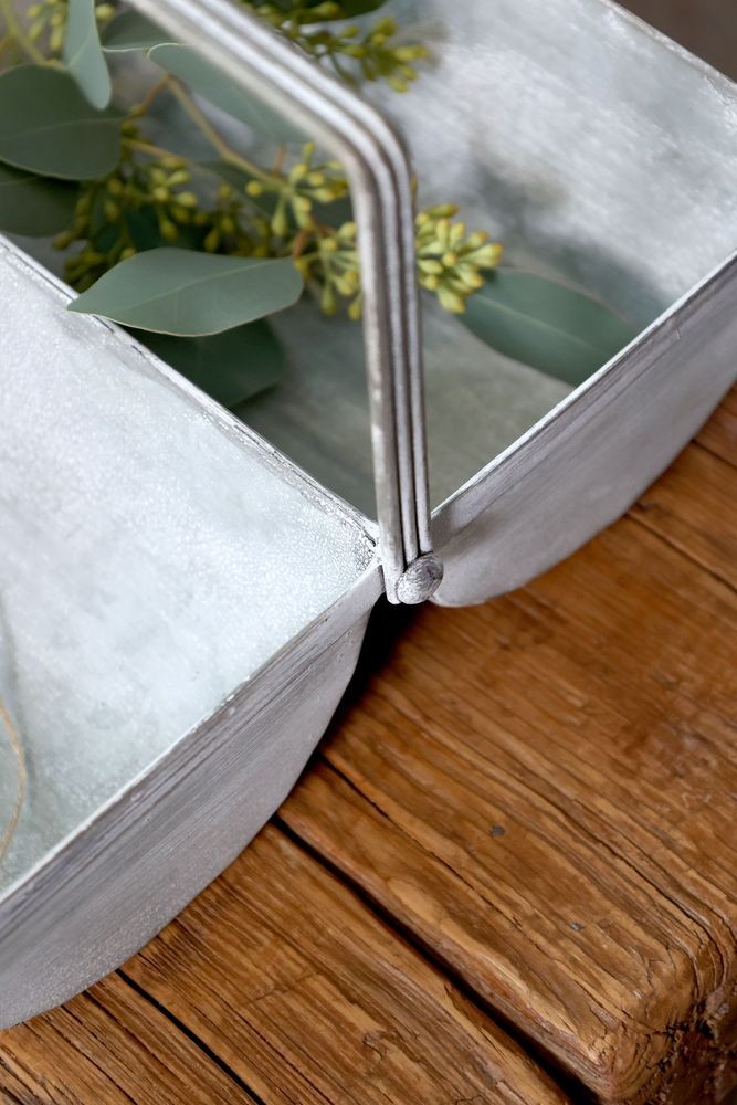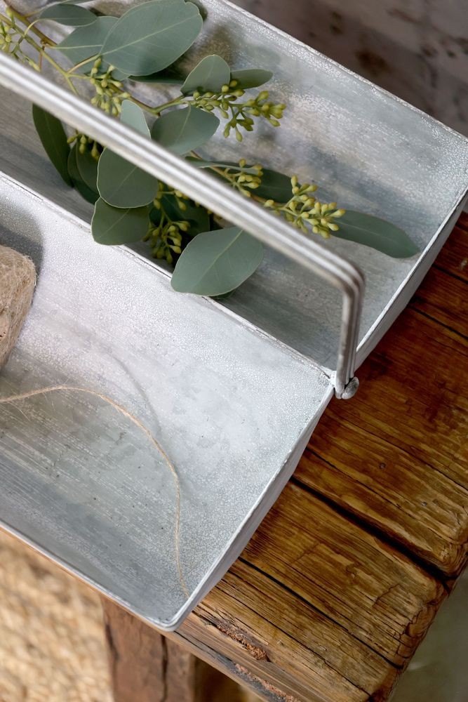 Dodejte svému interiéru, terase nebo zimní zahradě nezaměnitelné kouzlo venkova s tímto originálním plechovým boxem. Jeho design inspirovaný starou Francií se vyznačuje krásnou rustikální patinou a netradičním tvarem, který okamžitě upoutá pozornost. Dvě prostorné zaoblené přihrádky a elegantní tenká rukojeť z něj dělají nejen nádhernou dekoraci, ale především vysoce praktického pomocníka.