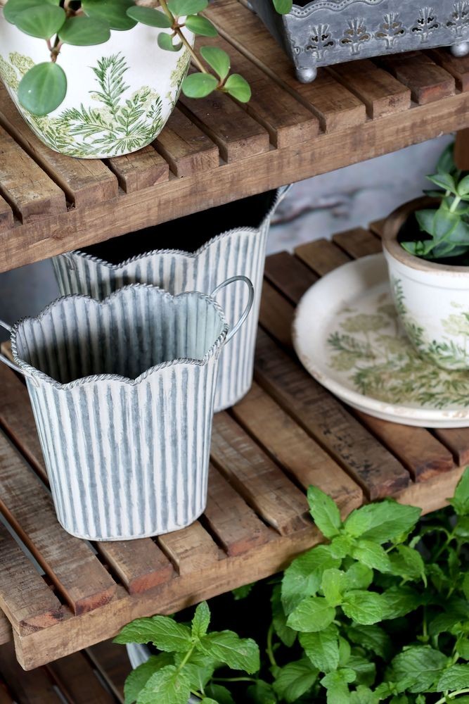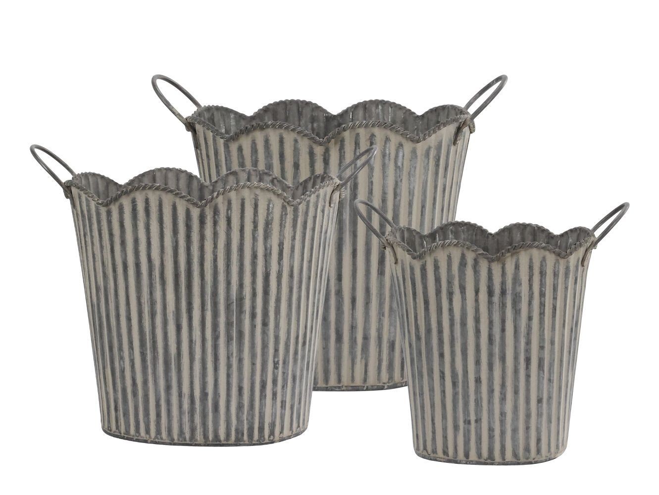 Vdechněte svému domovu, terase či balkonu romantickou atmosféru francouzského venkova! Tento okouzlující set tří plechových květináčů z kolekce „French Chic“ zaujme na první pohled svým nádherným tvarem s elegantně zvlněným horním okrajem, výraznými svislými drážkami a drobnými postranními oušky. Úmyslná světlá patina dodává celému setu autentický vintage vzhled, jako by tyto kousky pocházely přímo ze staré provensálské zahrady.