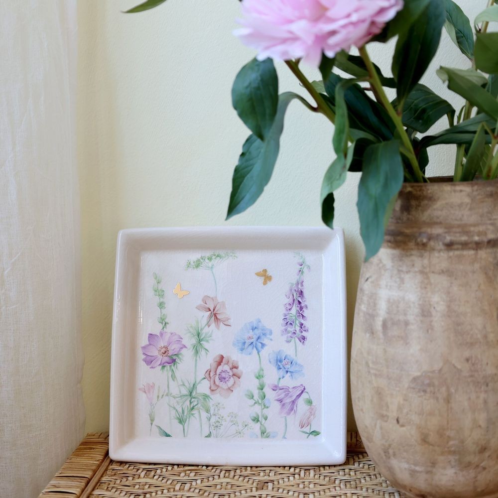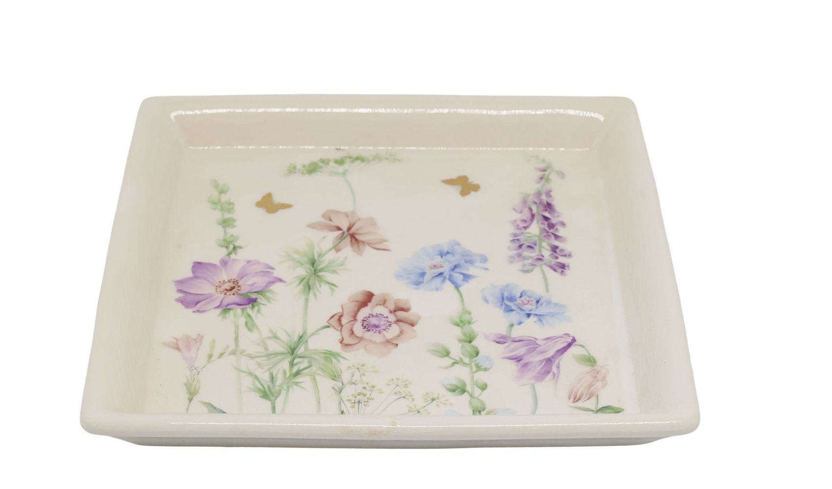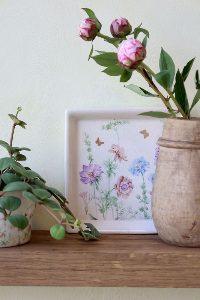Dodejte svému domovu nádech jarní lehkosti a vintage elegance s tímto okouzlujícím keramickým podnosem z kolekce Papillon Blossom. Čtvercový podnos s jemnou krémovou glazurou a autentickou antik úpravou s patinou (jemná crackle textura a odřený okraj) zdobí detailní, romantický motiv lučních květů a poletujících motýlů, inspirovaný starými botanickými ilustracemi.