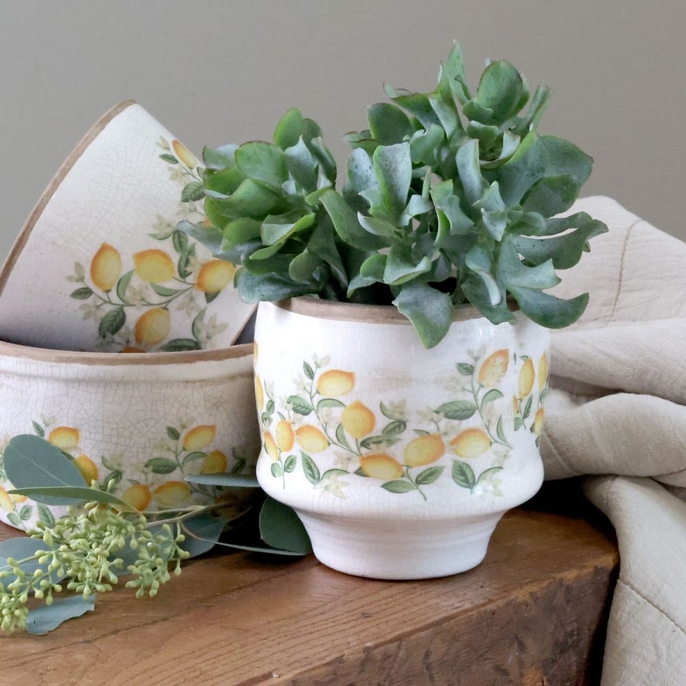 Dodejte svým rostlinám šmrnc a přeneste si kousek slunné Itálie přímo k vám domů! Tento okouzlující keramický květináč z oblíbené kolekce Limone Blossom je dokonalým spojením středomořského temperamentu a venkovské elegance. Světlý béžový základ s jemnou antik patinou a tmavším lemem tvoří perfektní pozadí pro svěží motiv šťavnatých žlutých citrónů a zelených lístků.