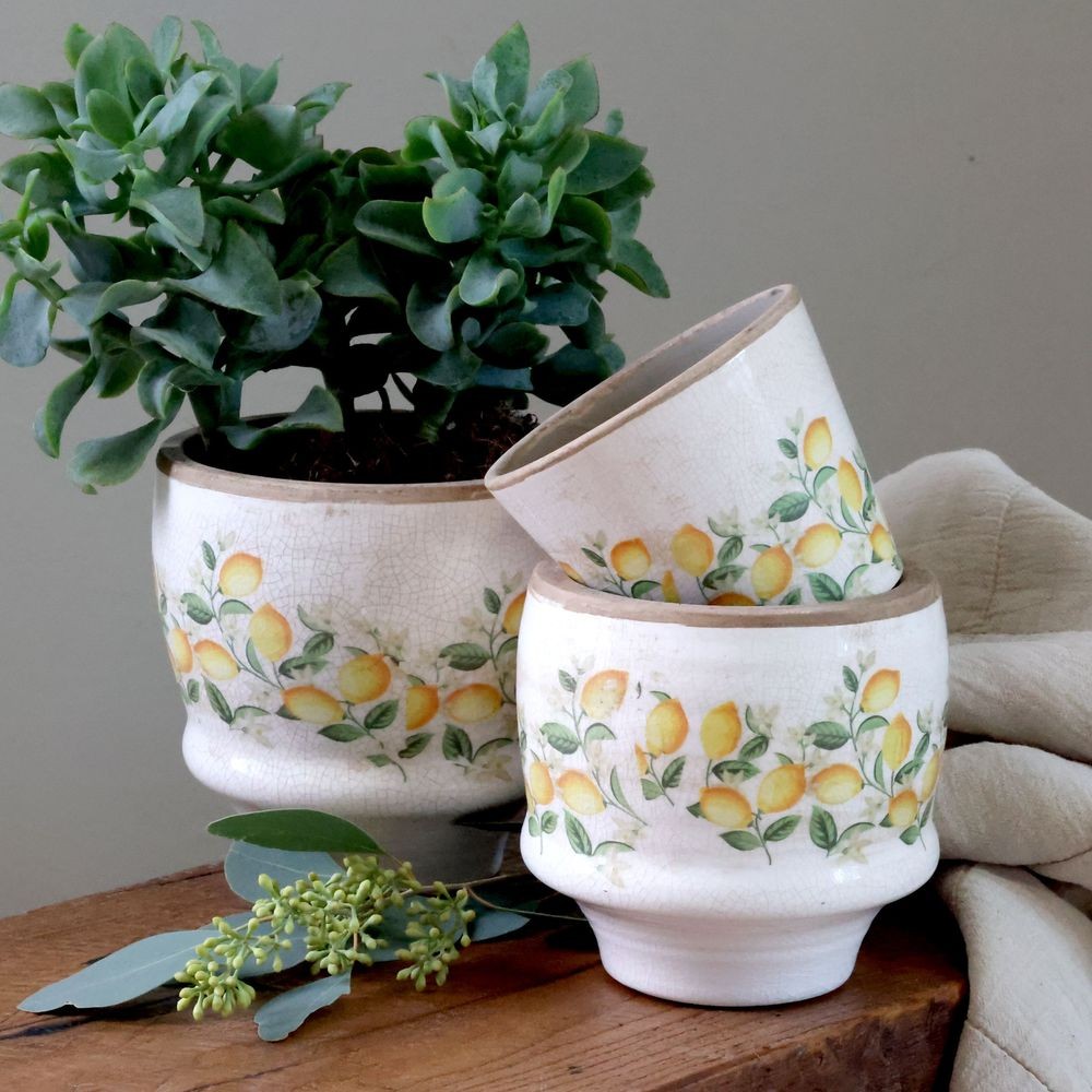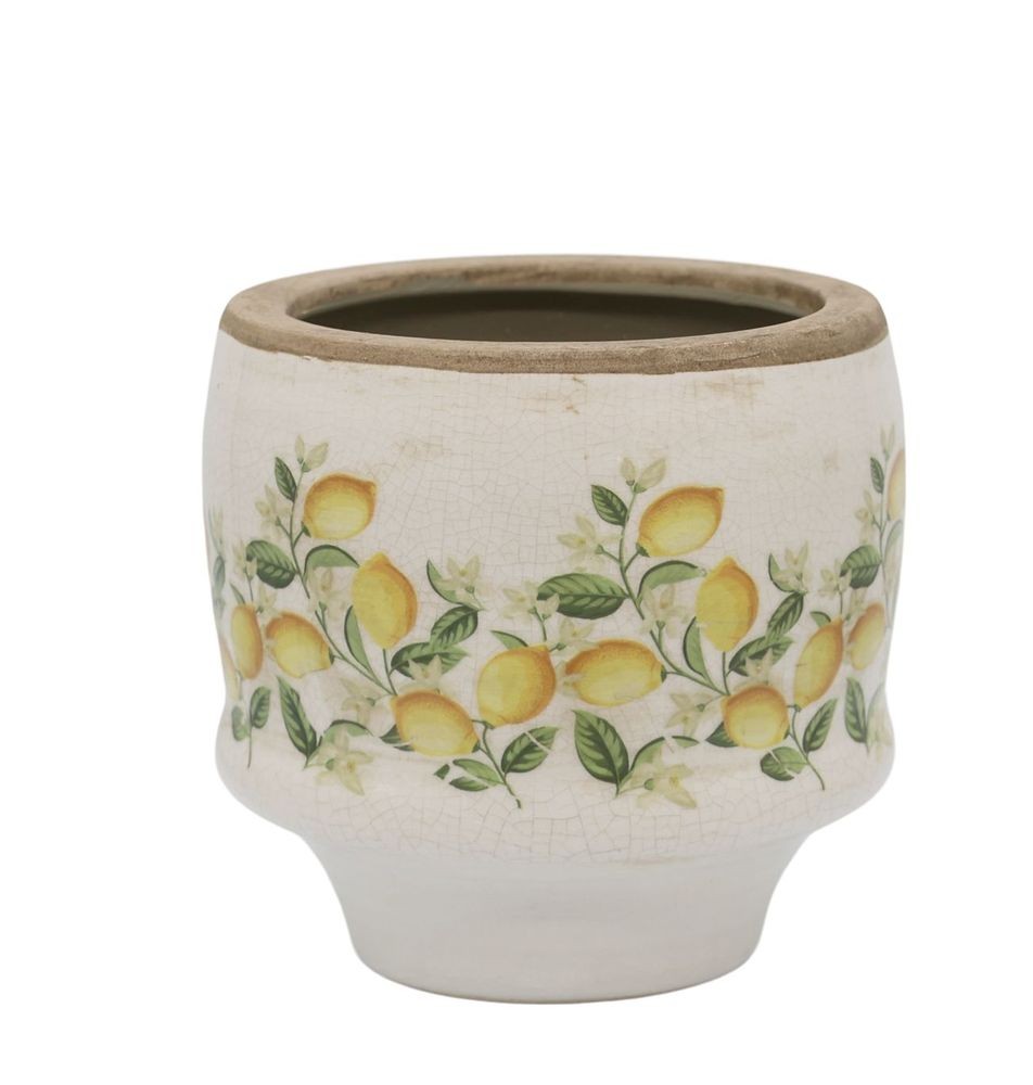 Dodejte svým rostlinám šmrnc a přeneste si kousek slunné Itálie přímo k vám domů! Tento okouzlující keramický květináč z oblíbené kolekce Limone Blossom je dokonalým spojením středomořského temperamentu a venkovské elegance. Světlý béžový základ s jemnou antik patinou a tmavším lemem tvoří perfektní pozadí pro svěží motiv šťavnatých žlutých citrónů a zelených lístků.